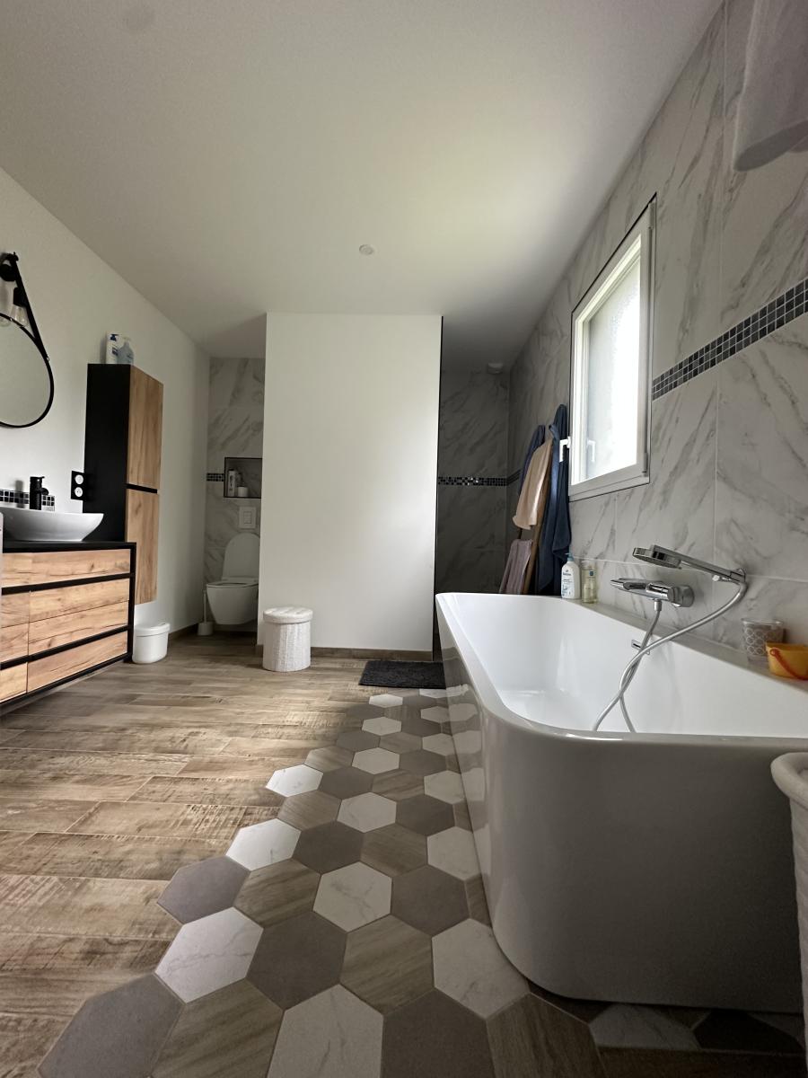 Il vous offre une pièce à vivre de 60m² avec cuisine aménagée et équipée (possibilité poêle à bois), une suite parentale (chambre + dressing + salle de bains (douche - baignoire et wc), une buanderie, un wc indépendant.