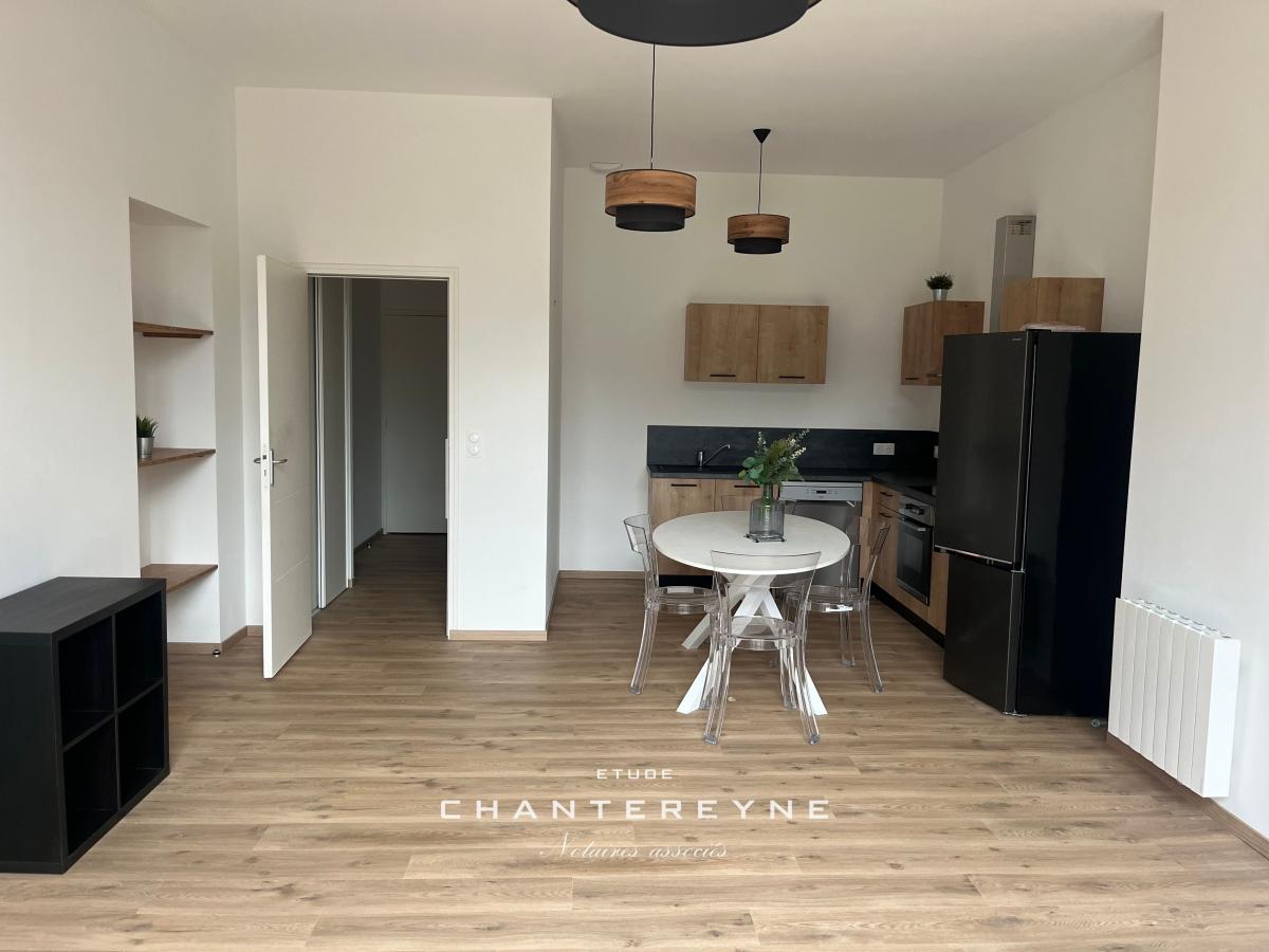 Grande pièce de vie avec belle hauteur sous plafond, cuisine aménagée et équipée (lave-linge, lave-vaisselle), dégagement, chambre, wc, salle d'eau.