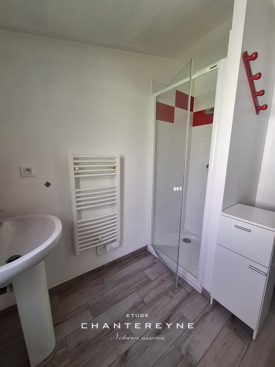 Au rez-de-chaussée: entrée dans pièce de vie avec coin cuisine (évier/plaques électrique/petit réfrigérateur), salle d'eau (lavabo, WC, douche)