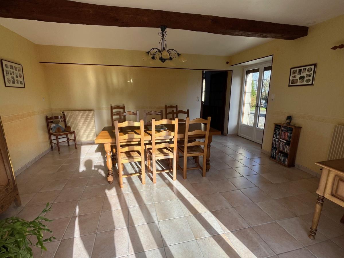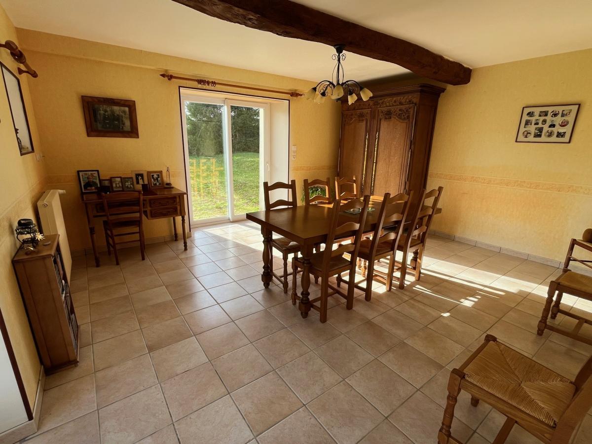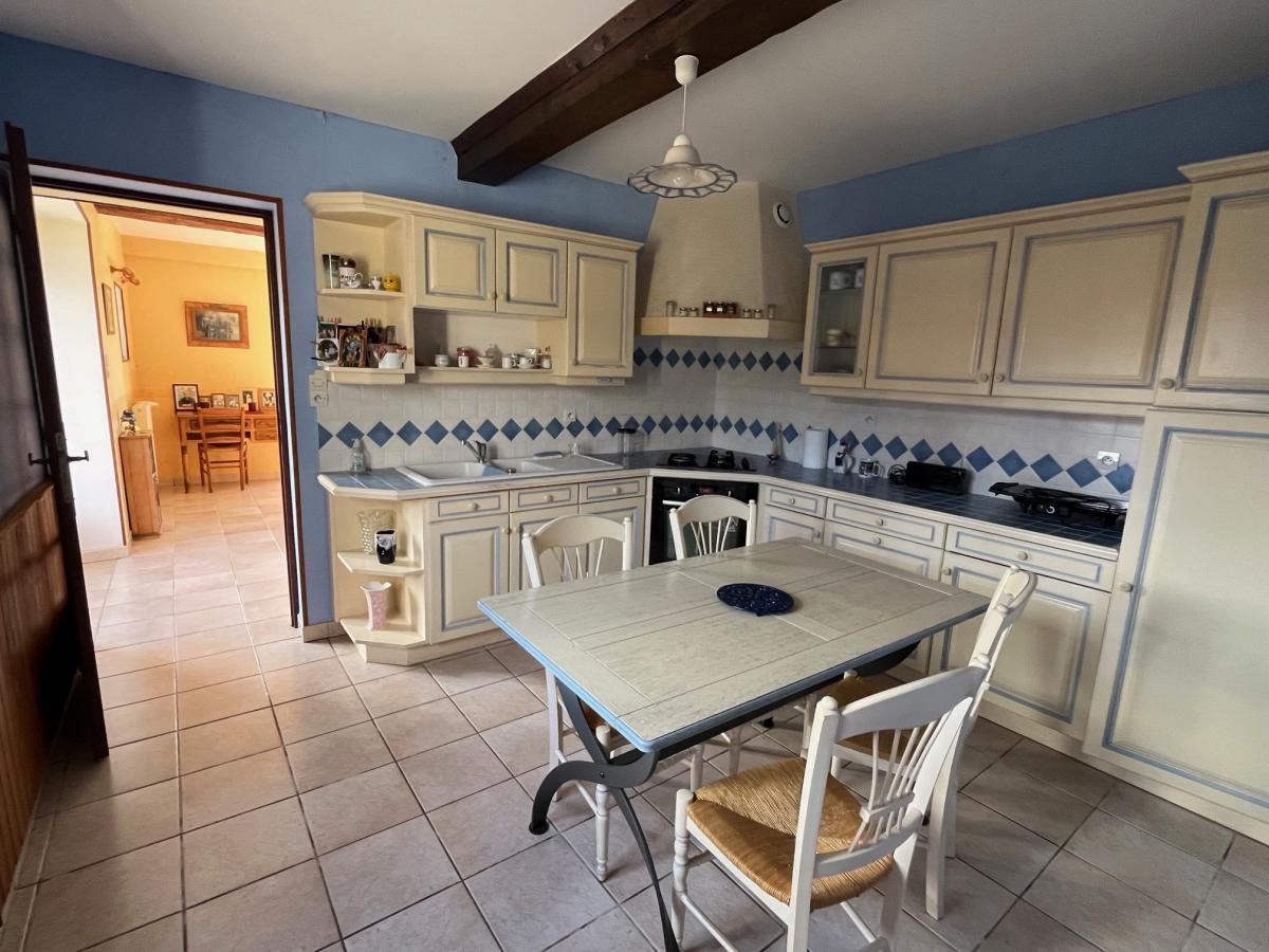 Salon avec départ d'escalier et cheminée 22 m², cuisine équipée (éléments hauts et bas, plaque de cuisson, hotte, four, réfrigérateur) 13 m², salle à manger 25 m², salle de douches avec wc,