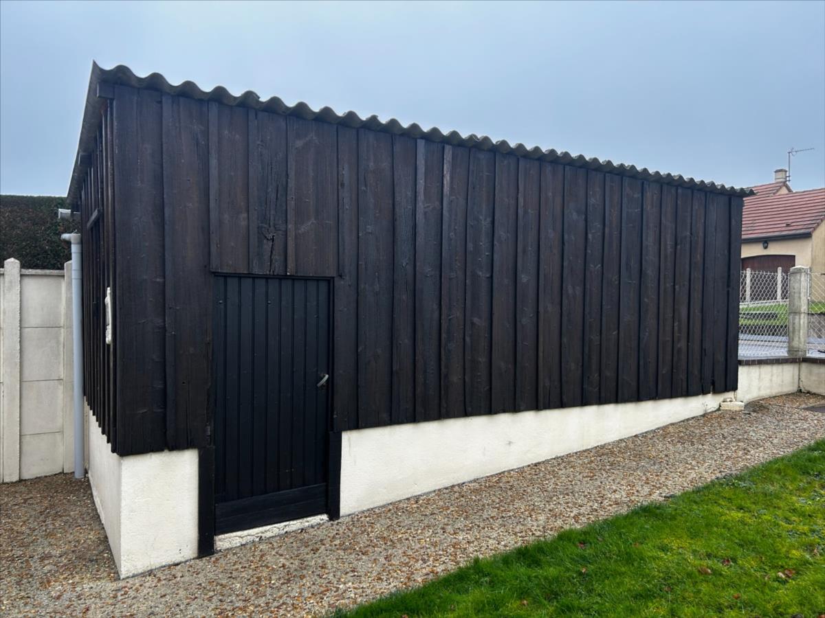 Terrain de 736m2. Garage en bois avec porte manuel pour accueillir une voiture.