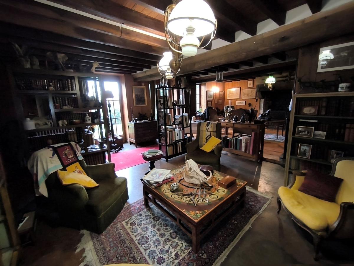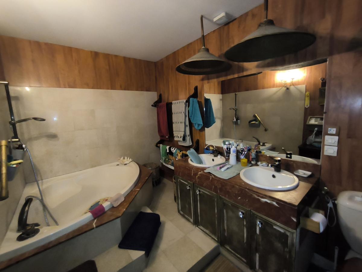 Le rez-de-chaussée est composé d'une entrée, un vaste salon de 45 m², un séjour, une cuisine, une chambre avec salle d'eau, un cabinet de toilette, chaufferie.