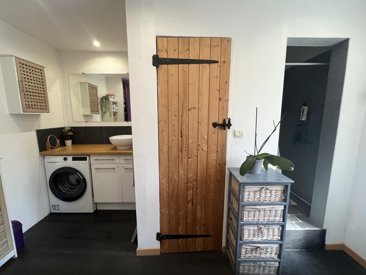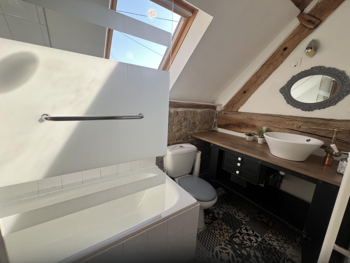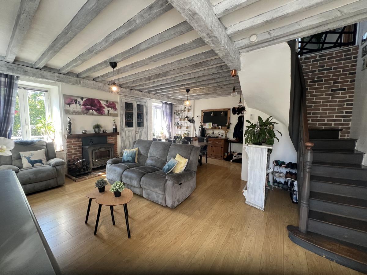 . Au RDC : séjour/salon avec poêle à bois, cuisine équipée, salle d'eau, WC ;