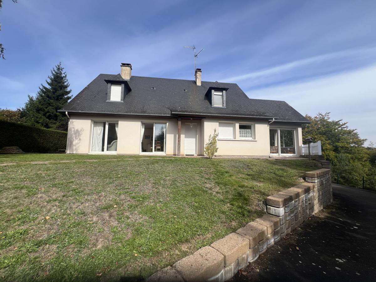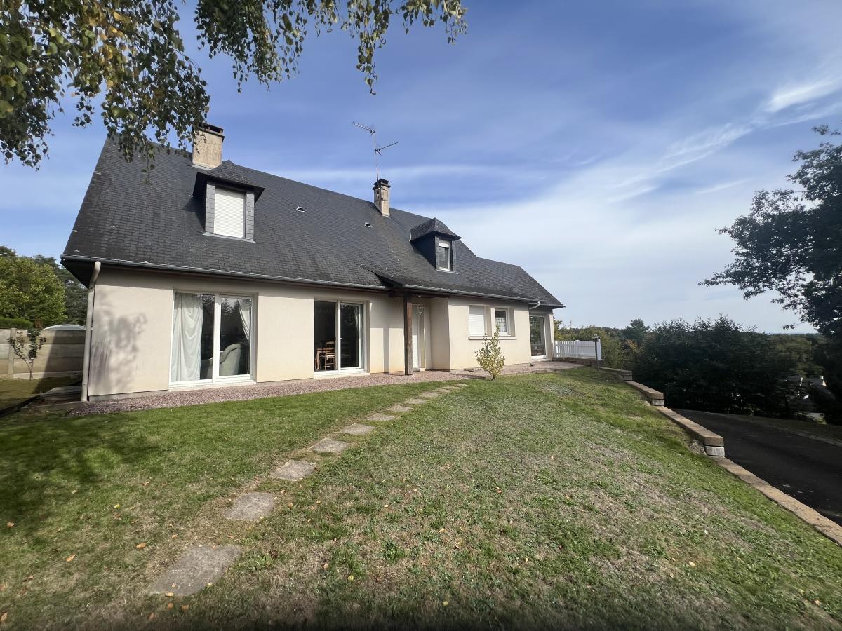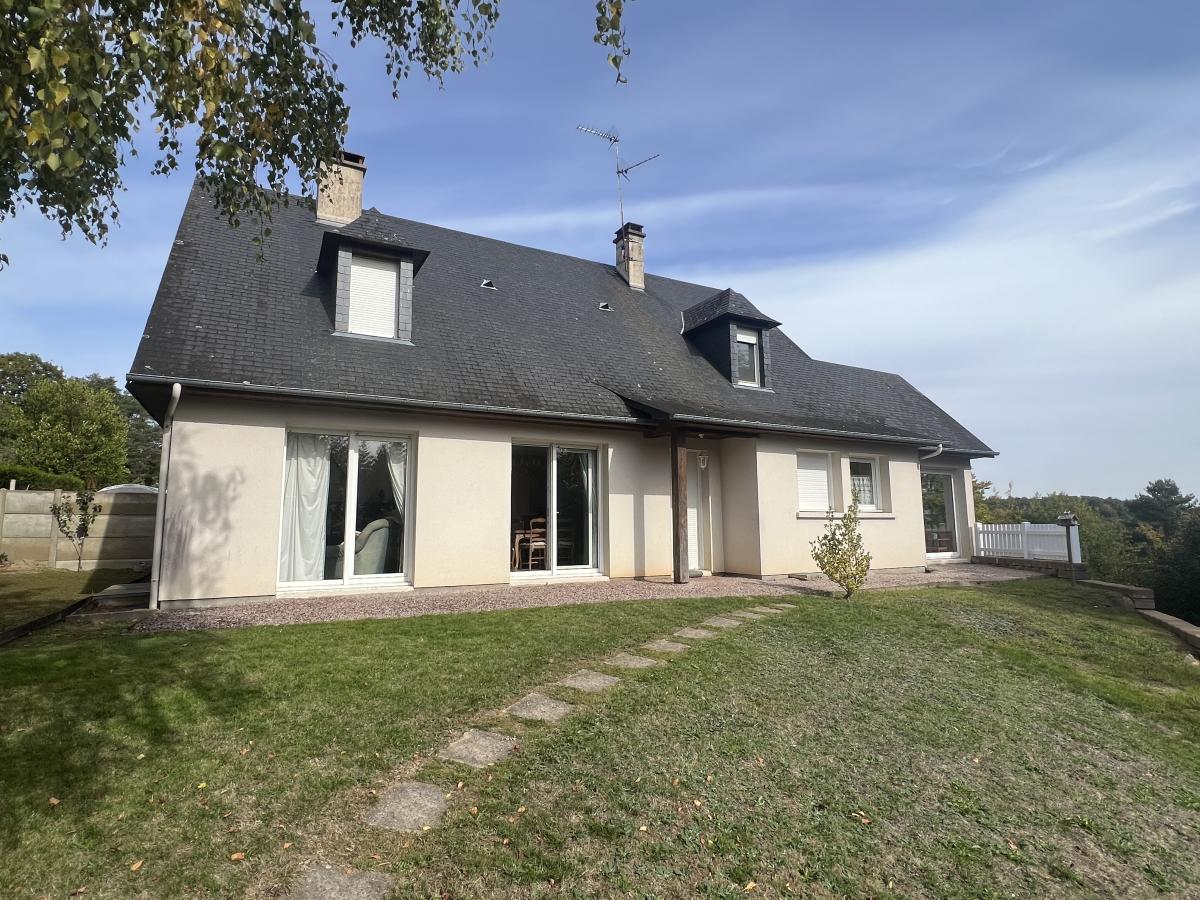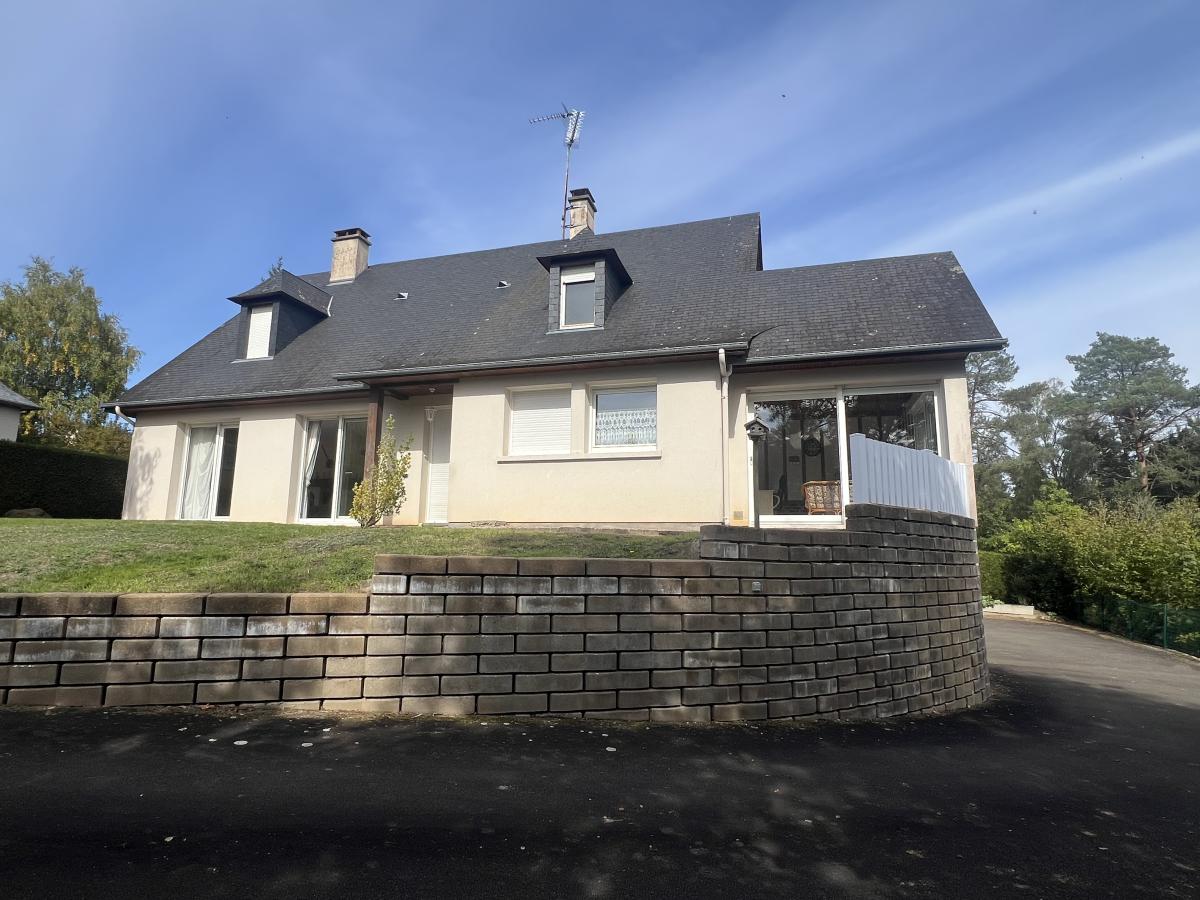 BAGNOLES DE L'ORNE, dans un environnement très calme avec vue dégagée, maison comprenant de plain-pied : séjour/salon avec cheminée foyer fermé, cuisine aménagée et équipée, grande arrière cuisine, véranda offrant beau panorama sur la campagne, dégagement avec placard, deux chambres dont une avec salle d'eau, salle de bains, WC.
