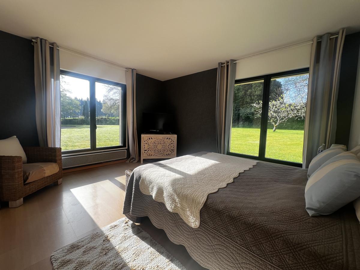 Terrain clos de 2000 m², portail électrique, terrasse et jardin sans vis-à-vis avec vue dégagée sur la campagne environnante.