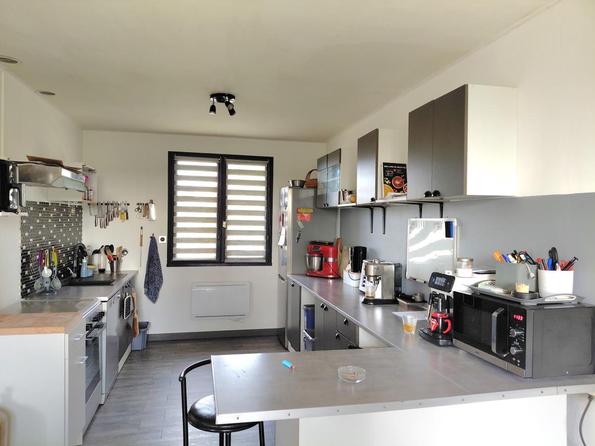 Entrée - Cuisine aménagée et équipée ouverte sur un séjour lumineux de 38 m², avec accès direct à la terrasse et au jardin, offrant une vue dégagée sur la campagne,