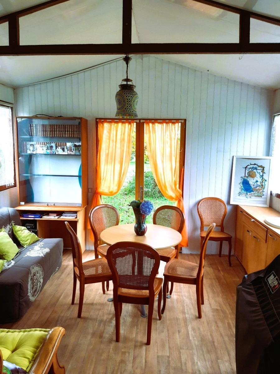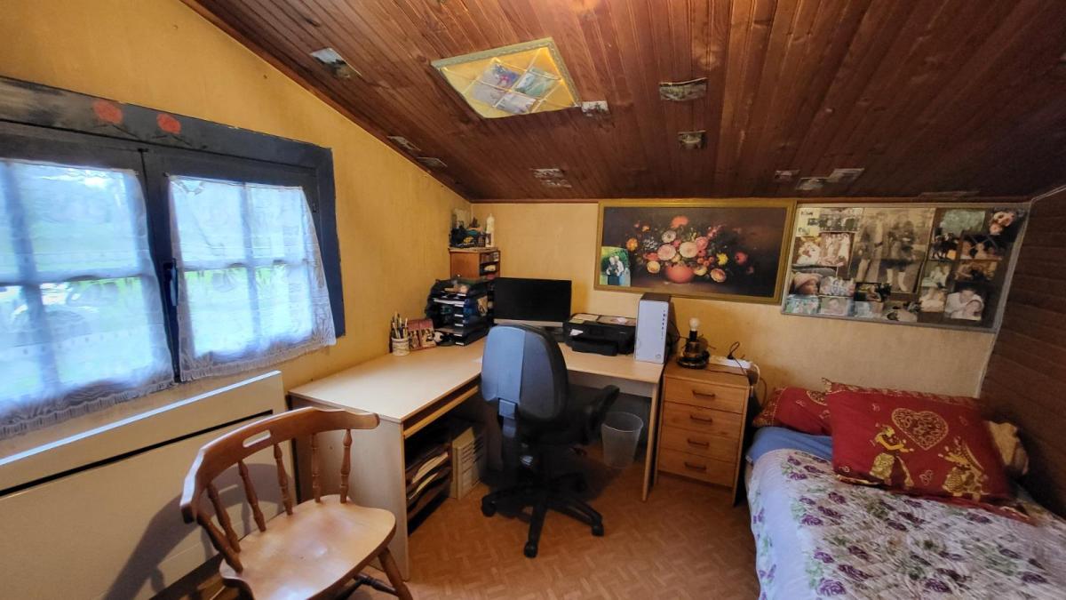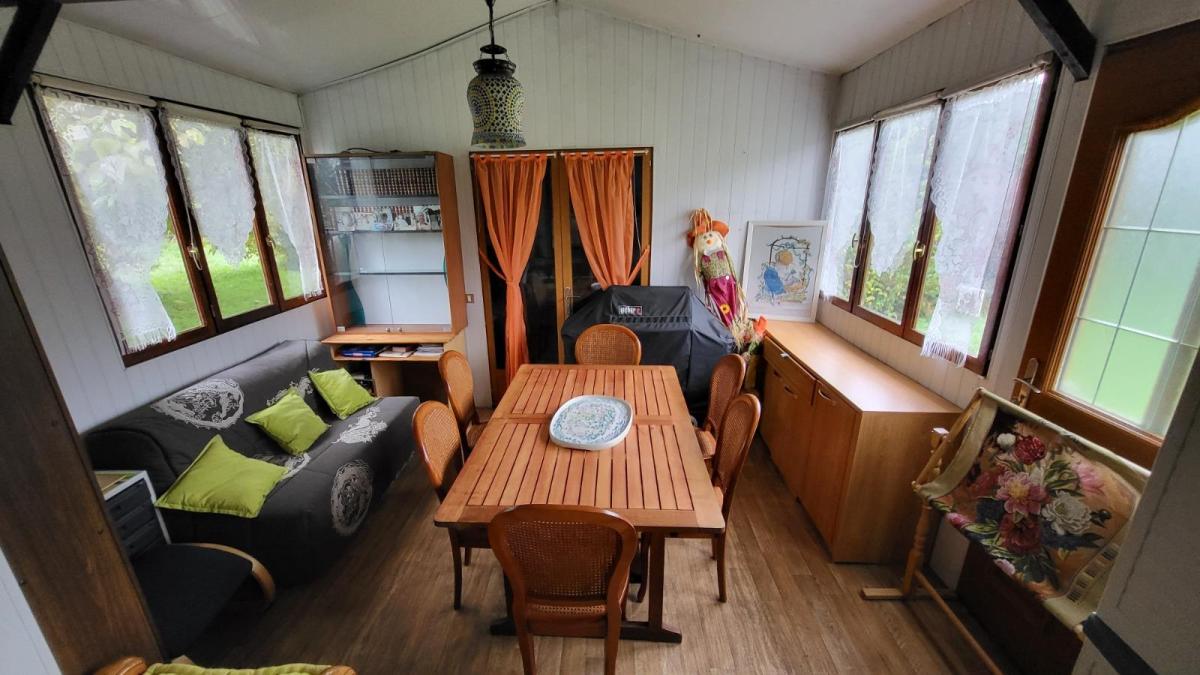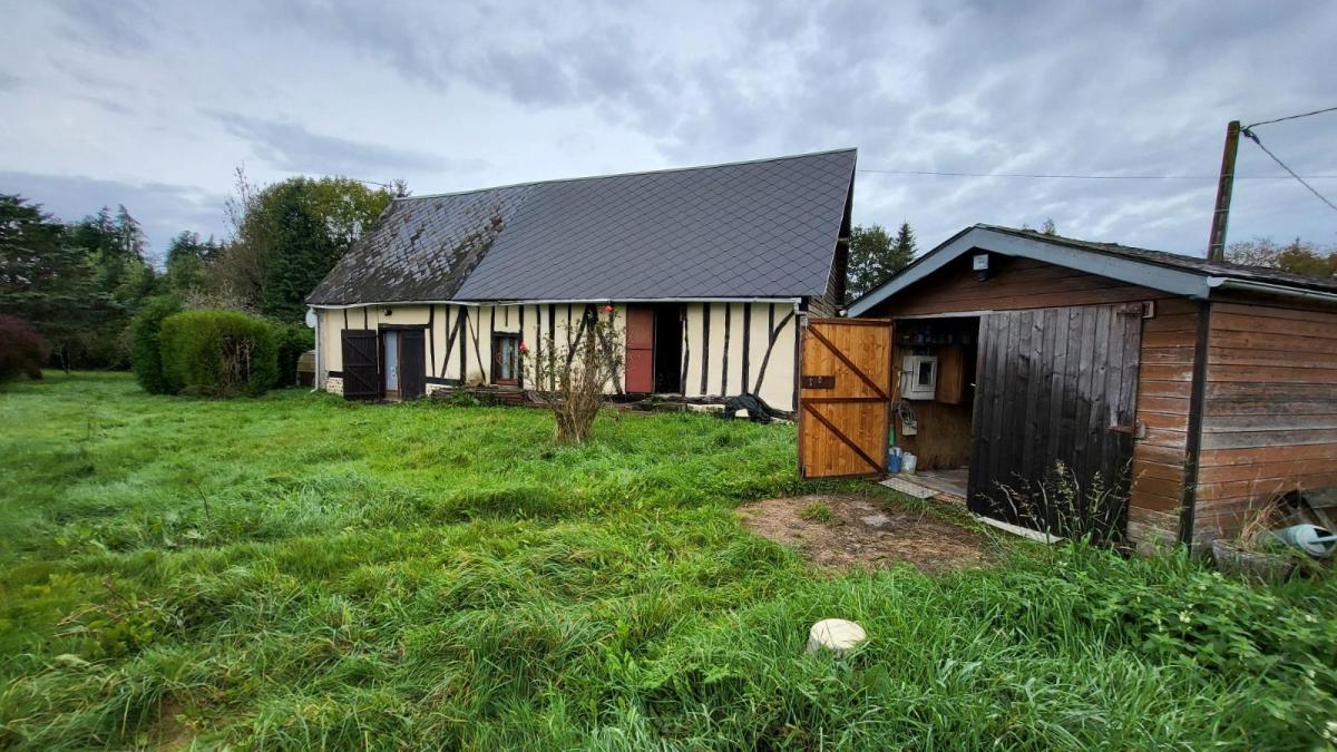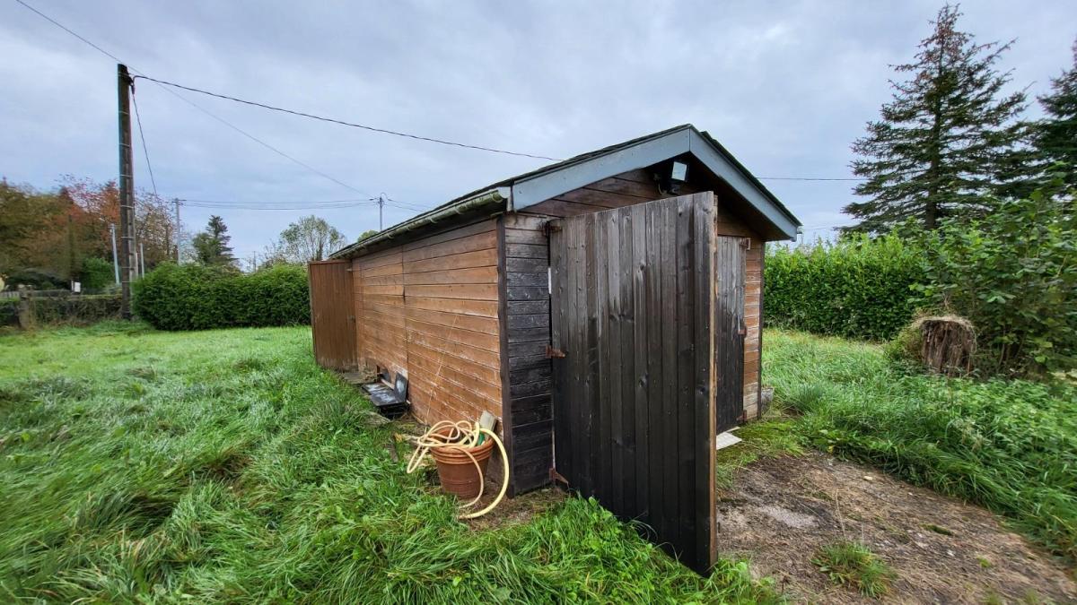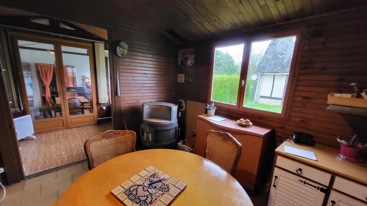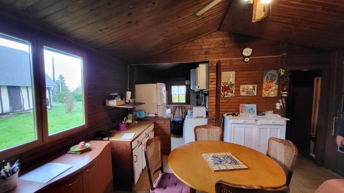1/ Chalet en bois comprenant séjour avec poêle à bois, salle à manger, une chambre, salle de douche, wc 2/ Grange en colombage comprenant cuisine, salle de douche avec wc, bureau 3/ Garage en bois, le tout sur un terrain plat de 5086 m², en campagne au calme. Logement à consommation énergétique excessive Les informations sur les risques auxquels ce bien est exposé sont disponibles sur le site Géorisques : www. georisques. gouv. fr