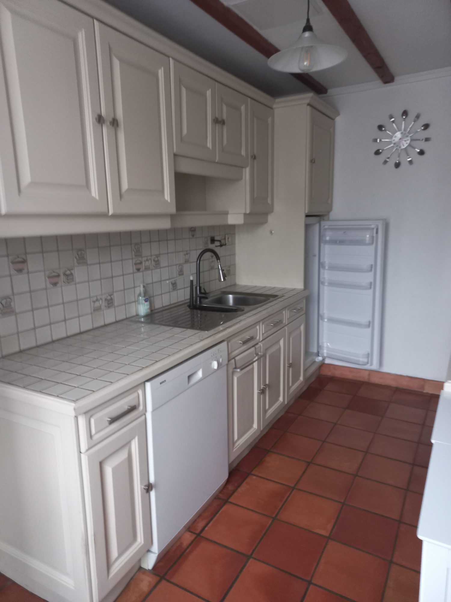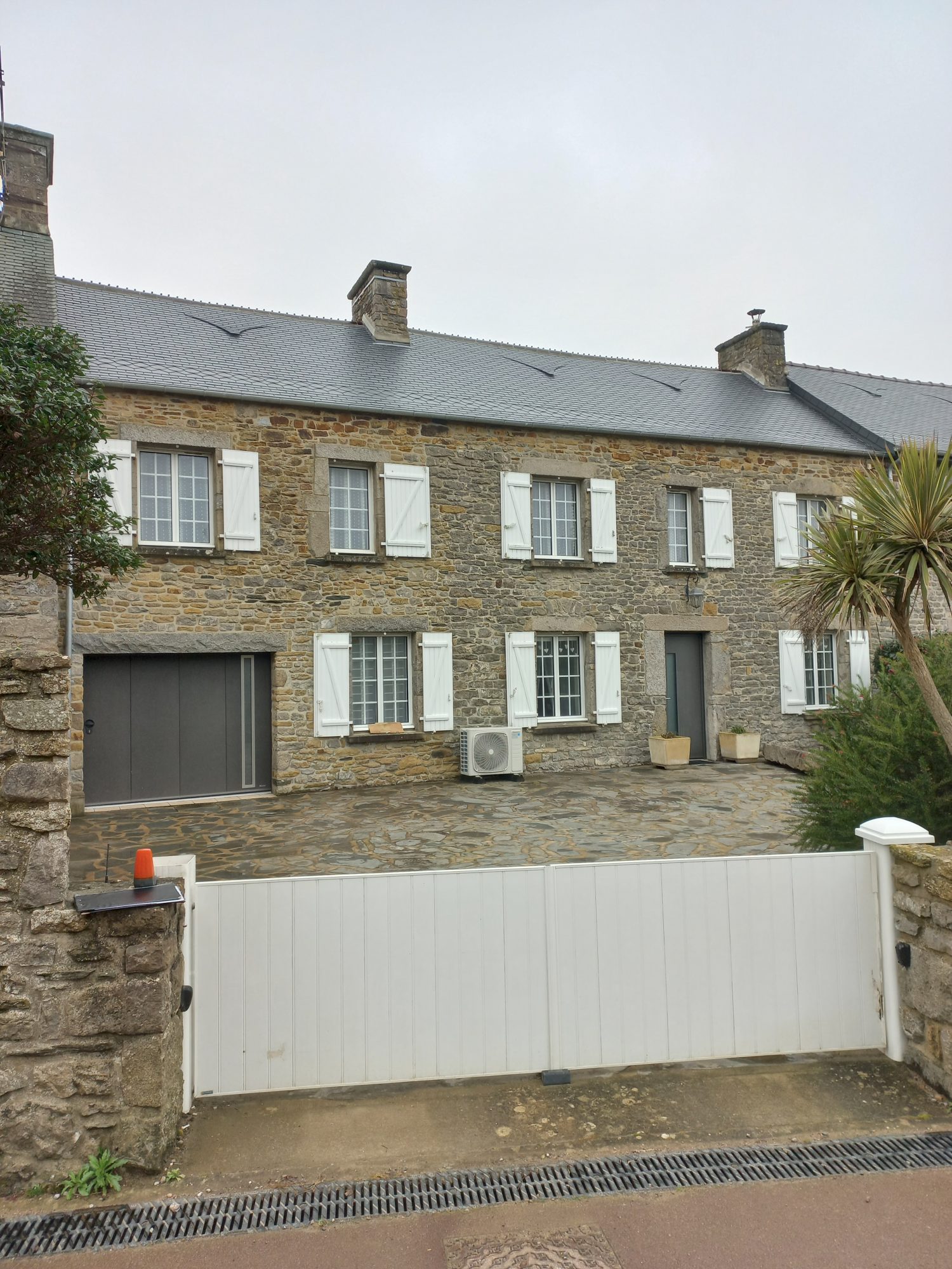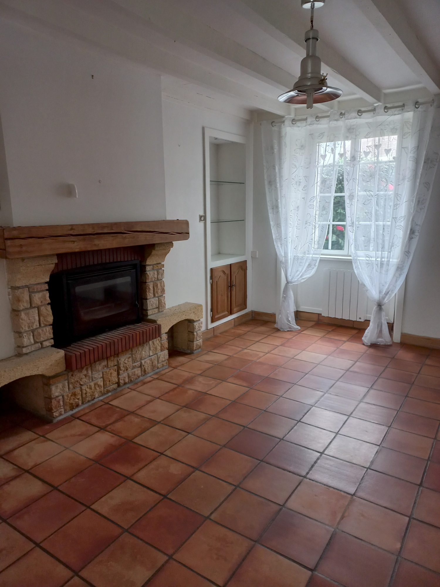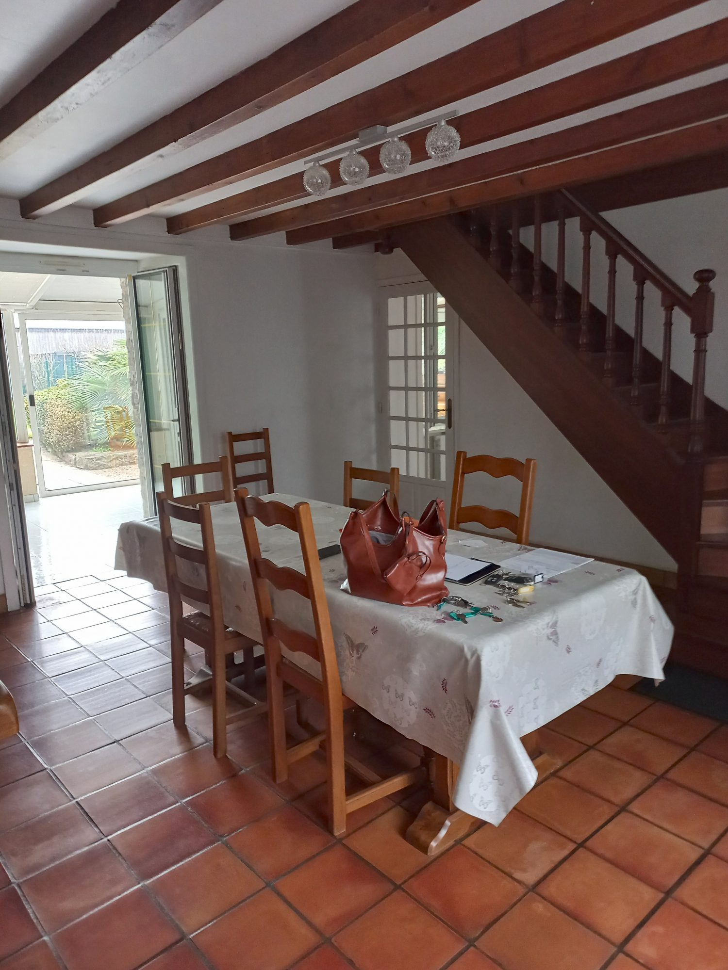 - Rez-de-chaussée : véranda, salle à manger, salon avec cheminée, cuisine aménagée et équipée (four, hotte, plaque électrique, réfrigérateur), WC avec lave mains
