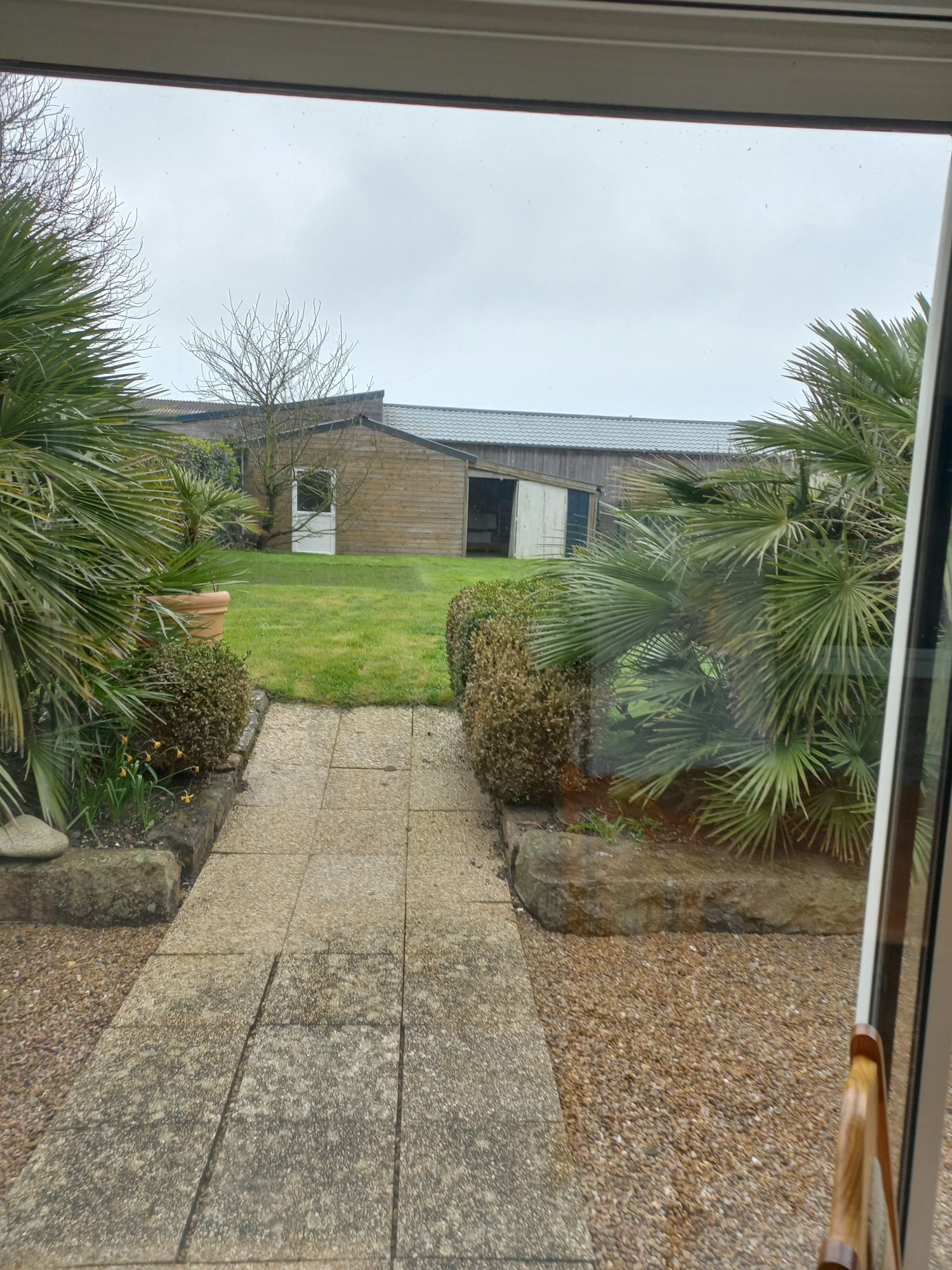 Garage. Cour devant et jardin derrière.