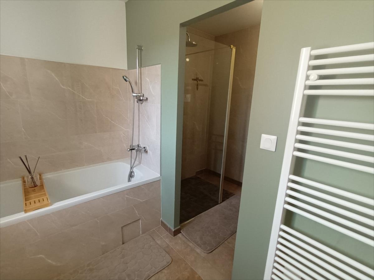 de bains (douche et baignoire) avec espace buanderie, séjour avec poêle à bois ouvert sur cuisine aménagée et équipée