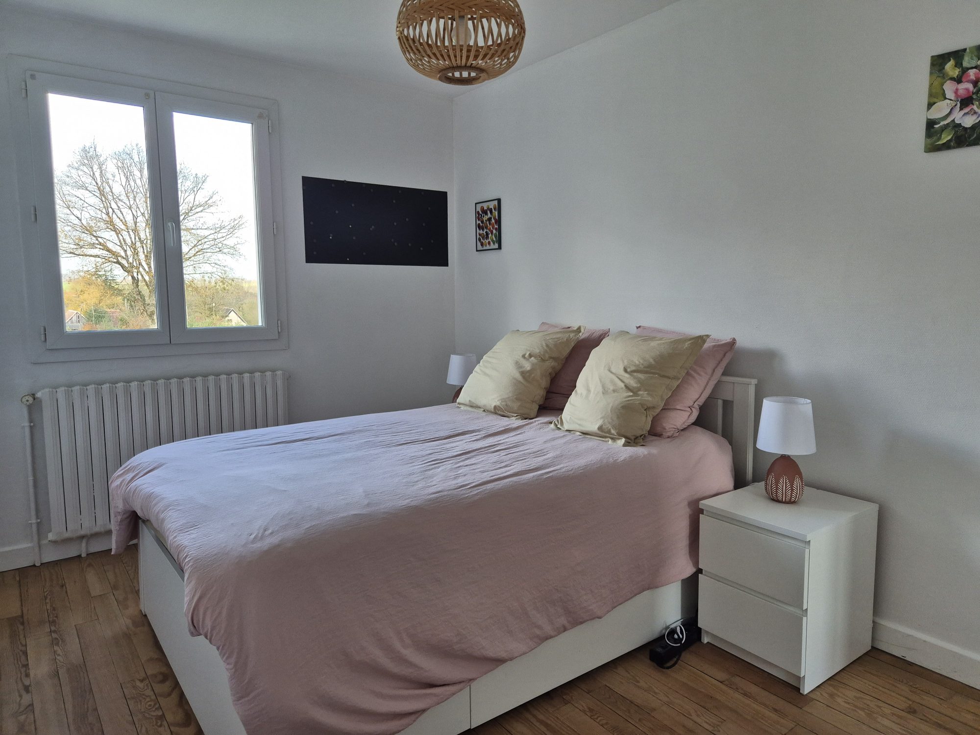 Elle comprend au rez-de-chaussée : une entrée, un séjour avec insert et balcon, une cuisine aménagée, trois chambres dont une avec un point d'eau, une salle de bains et un WC.