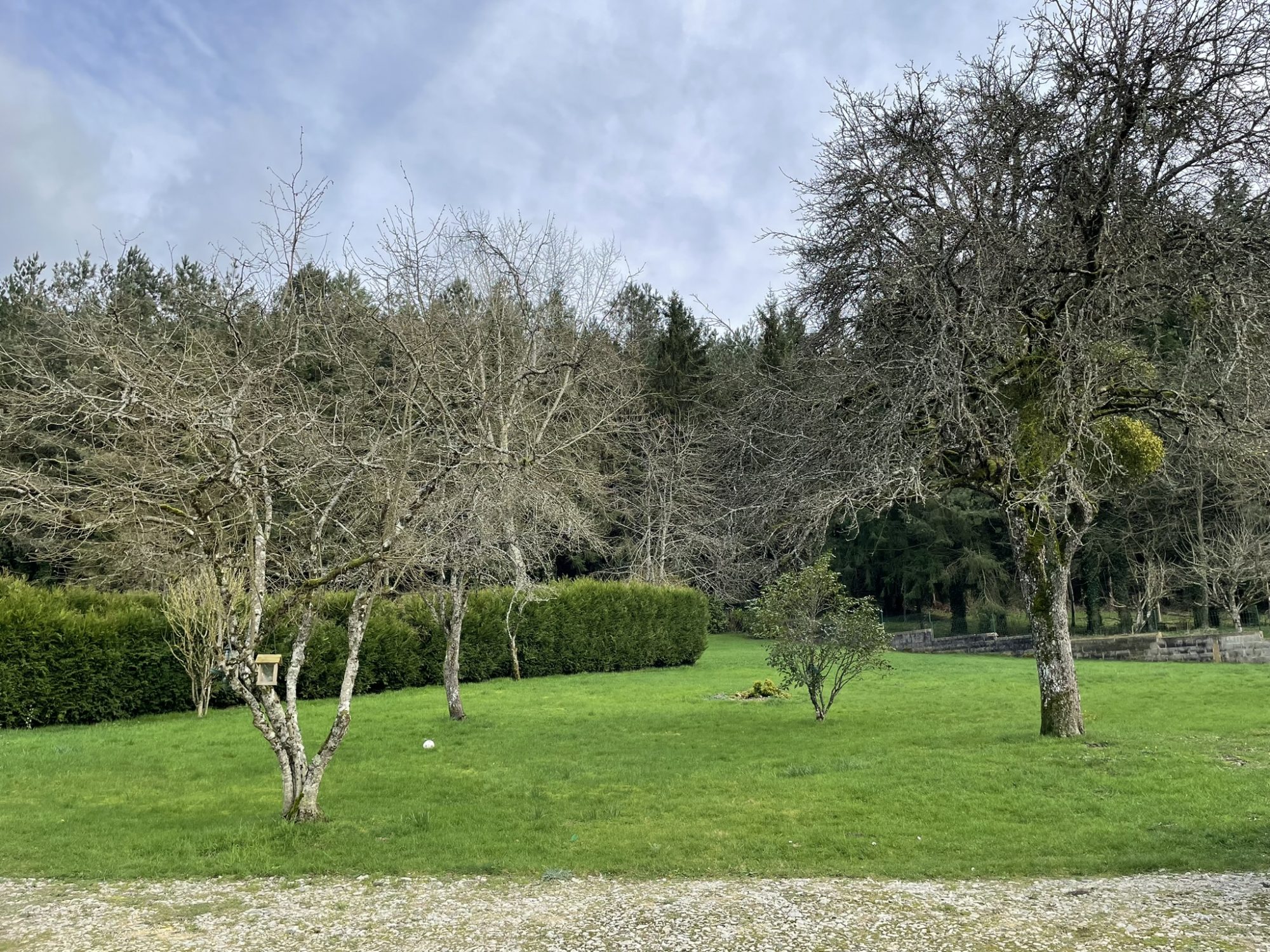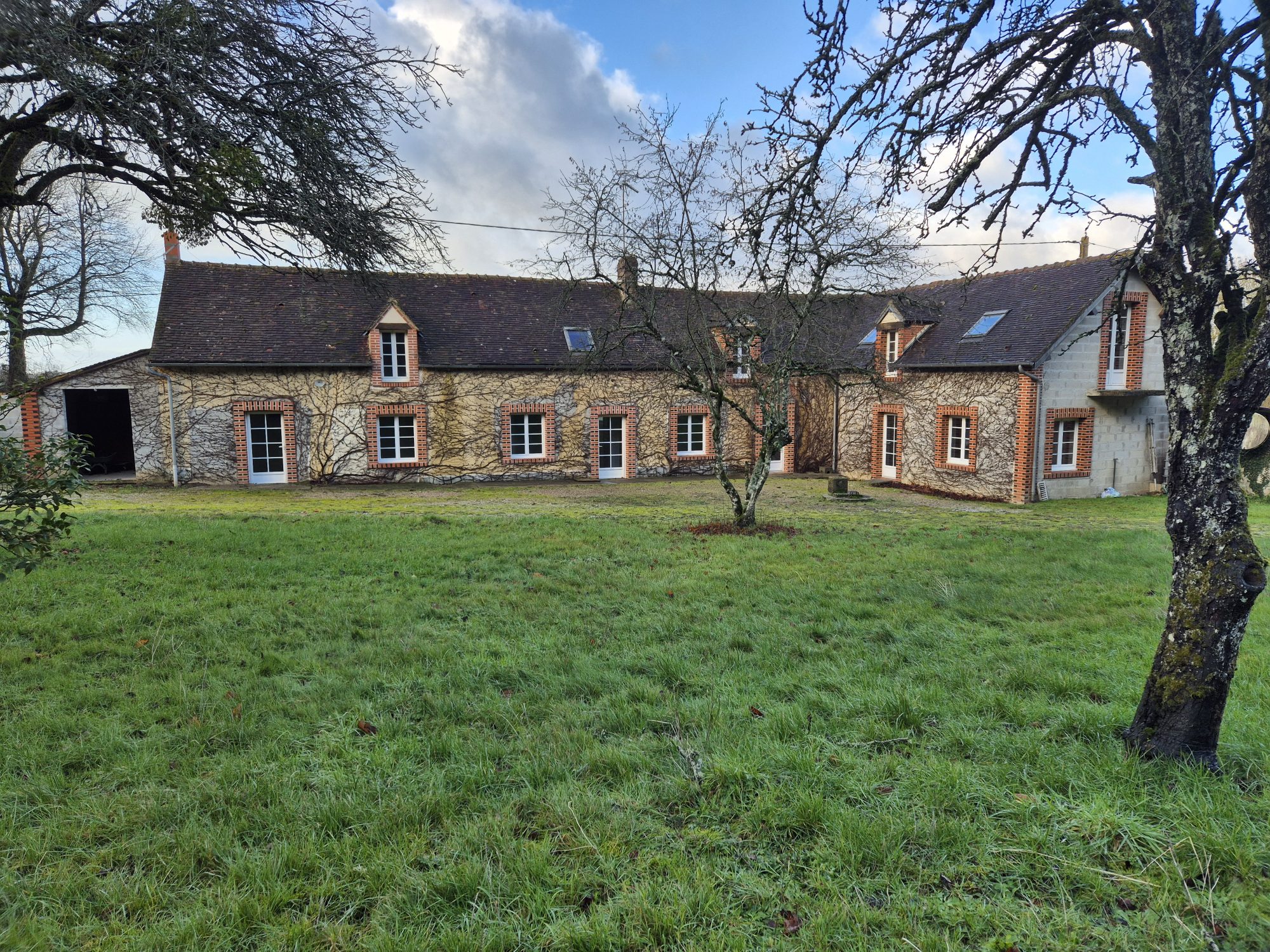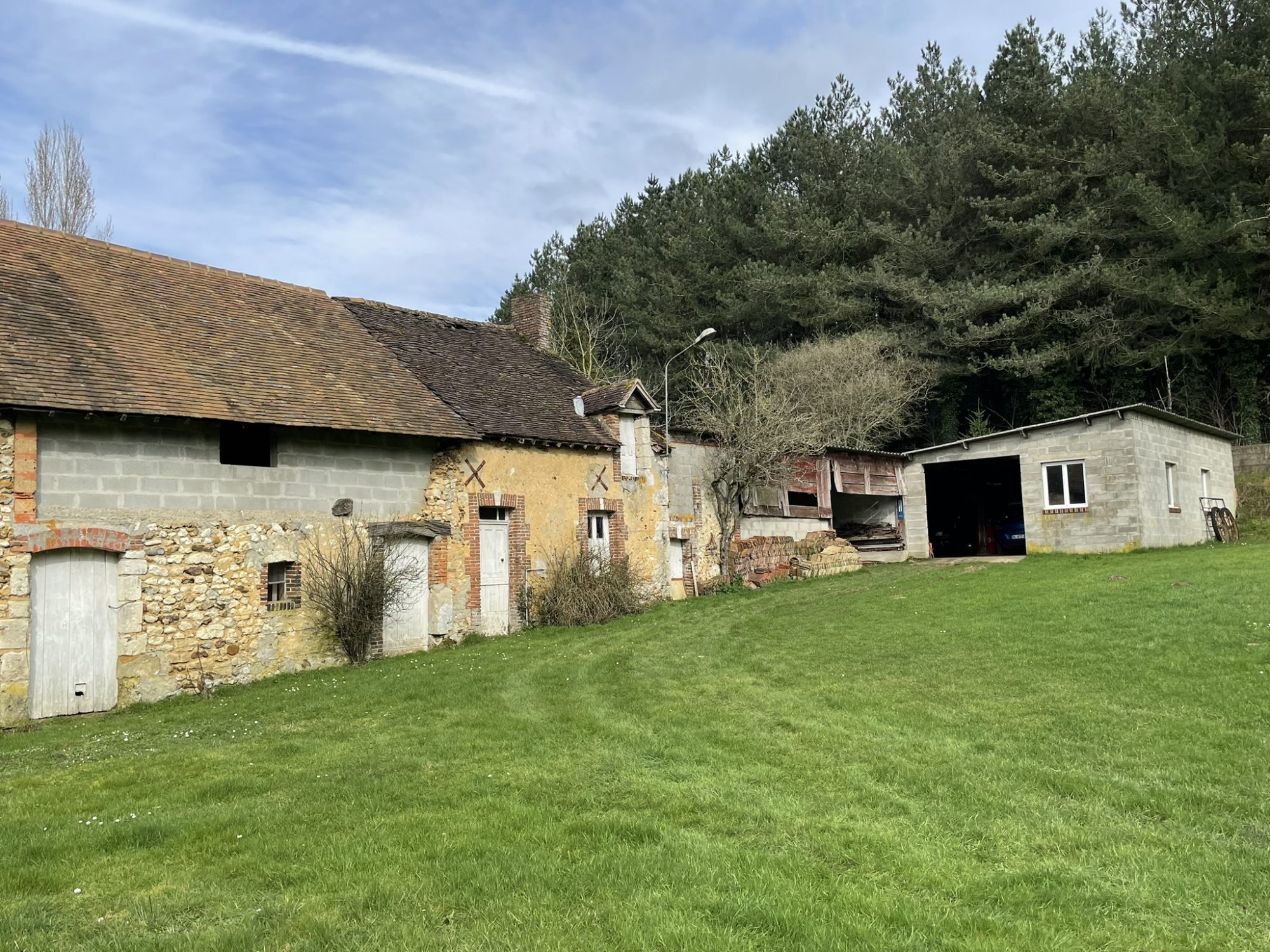 À l’étage, une première partie comprend une pièce palière, une chambre et une mezzanine, tandis qu’une seconde partie offre un bureau, une chambre, un WC et un grenier. Une grande dépendance complète l’ensemble, édifié sur un terrain clos d’une superficie de 3 103 m².