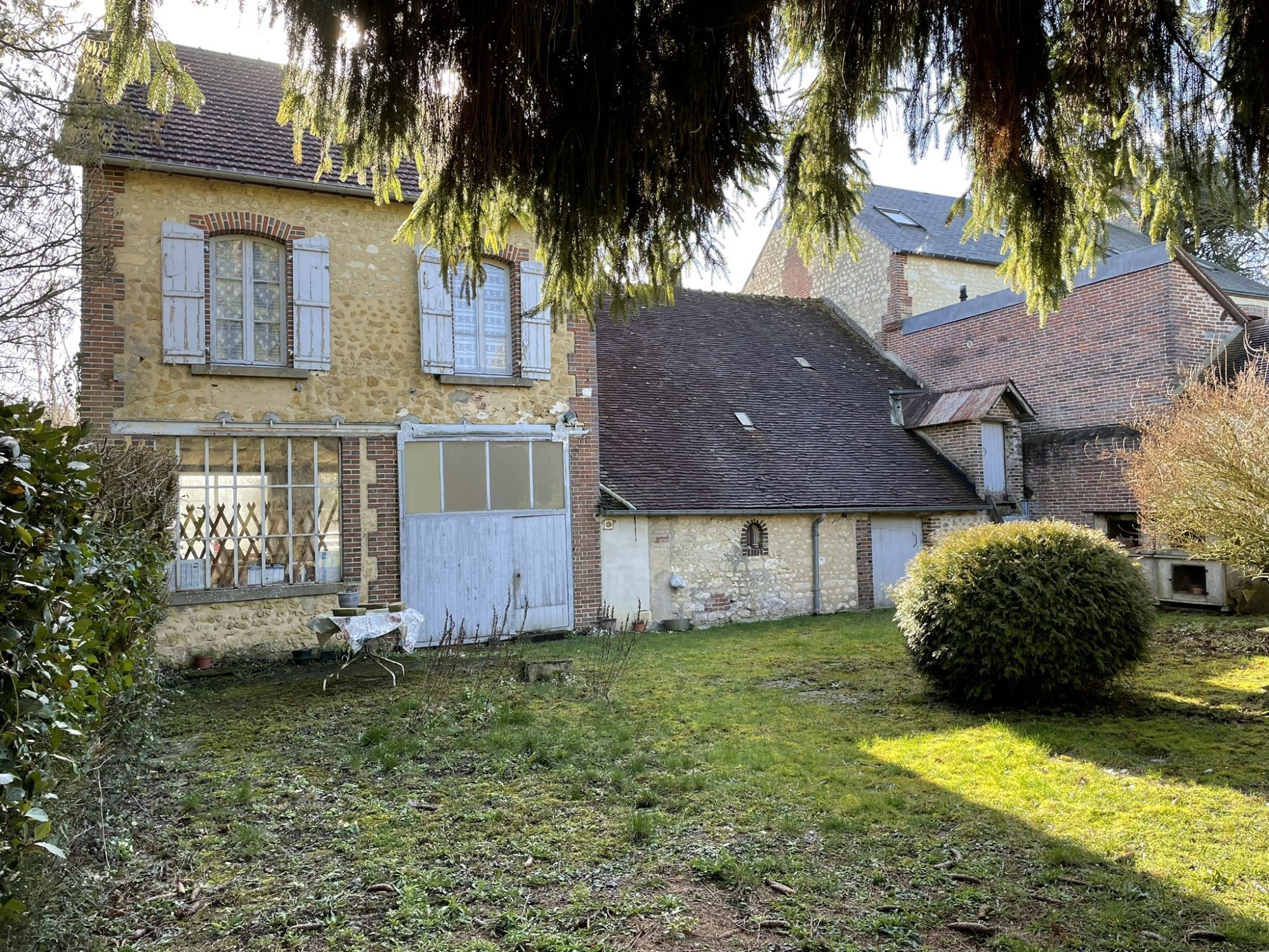 Au cœur d'un village entre idéalement situé entre MORTAGNE AU PERCHE et LE MÊLE SUR SARTHE, maison ancienne avec cour et jardin dans un environnement calme. Au rez-de-chaussée : entrée, séjour, cuisine et WC, et la suite : caves et vaste garage/atelier avec verrière, offrant un potentiel d'aménagement. A l'étage : deux chambres et une salle de bains. Cour sur l'avant et jardin clos et arboré d'environ 900 m² à l'arrière avec dépendance en bois.