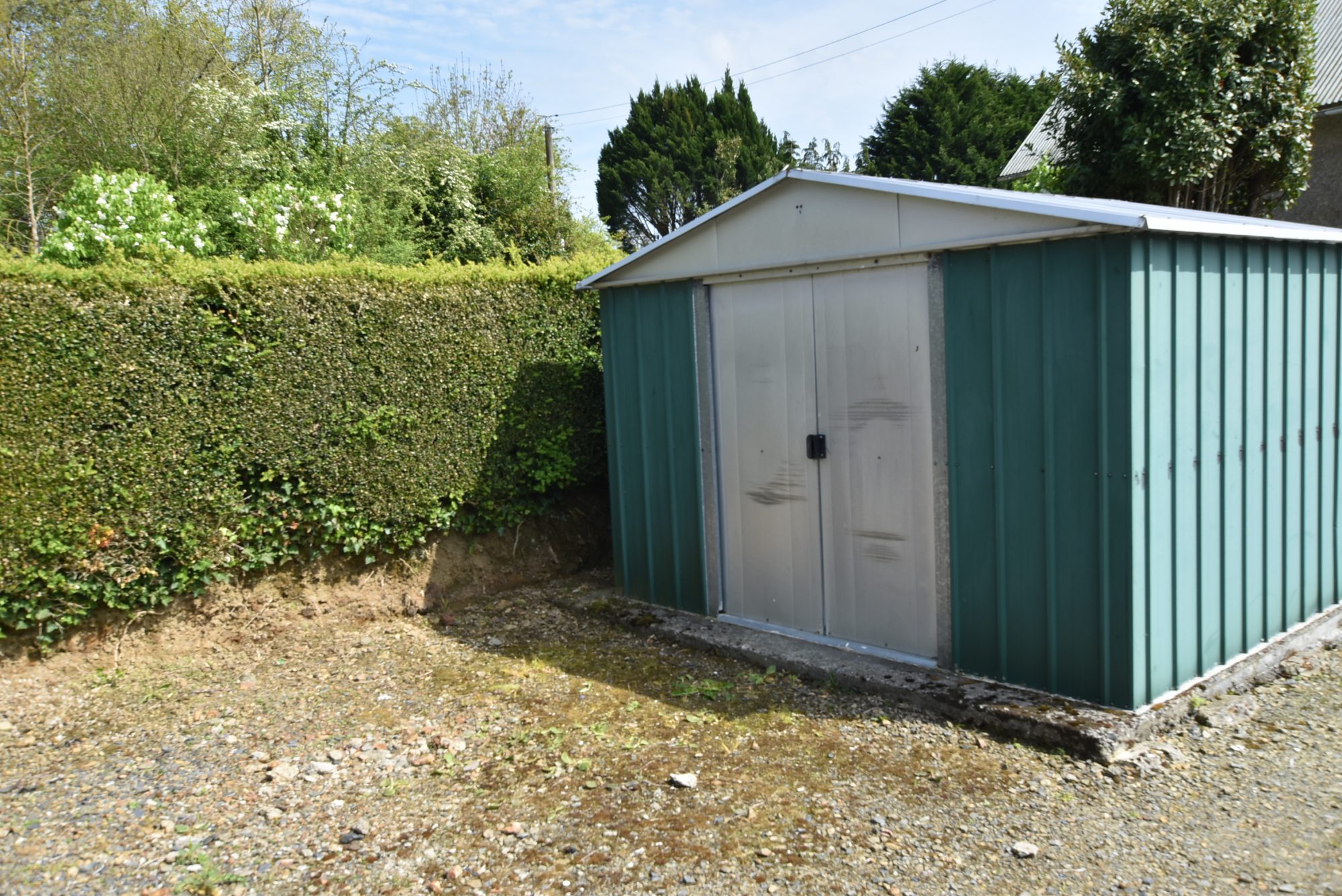 Petite cour devant sur laquelle se trouve un abri de jardin.