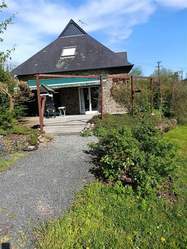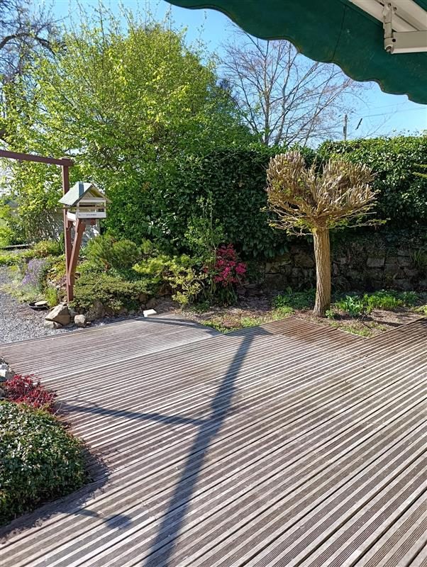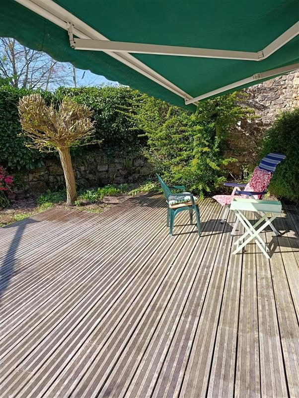 Garage, jardin paysagé et terrasse bois avec store-banne.