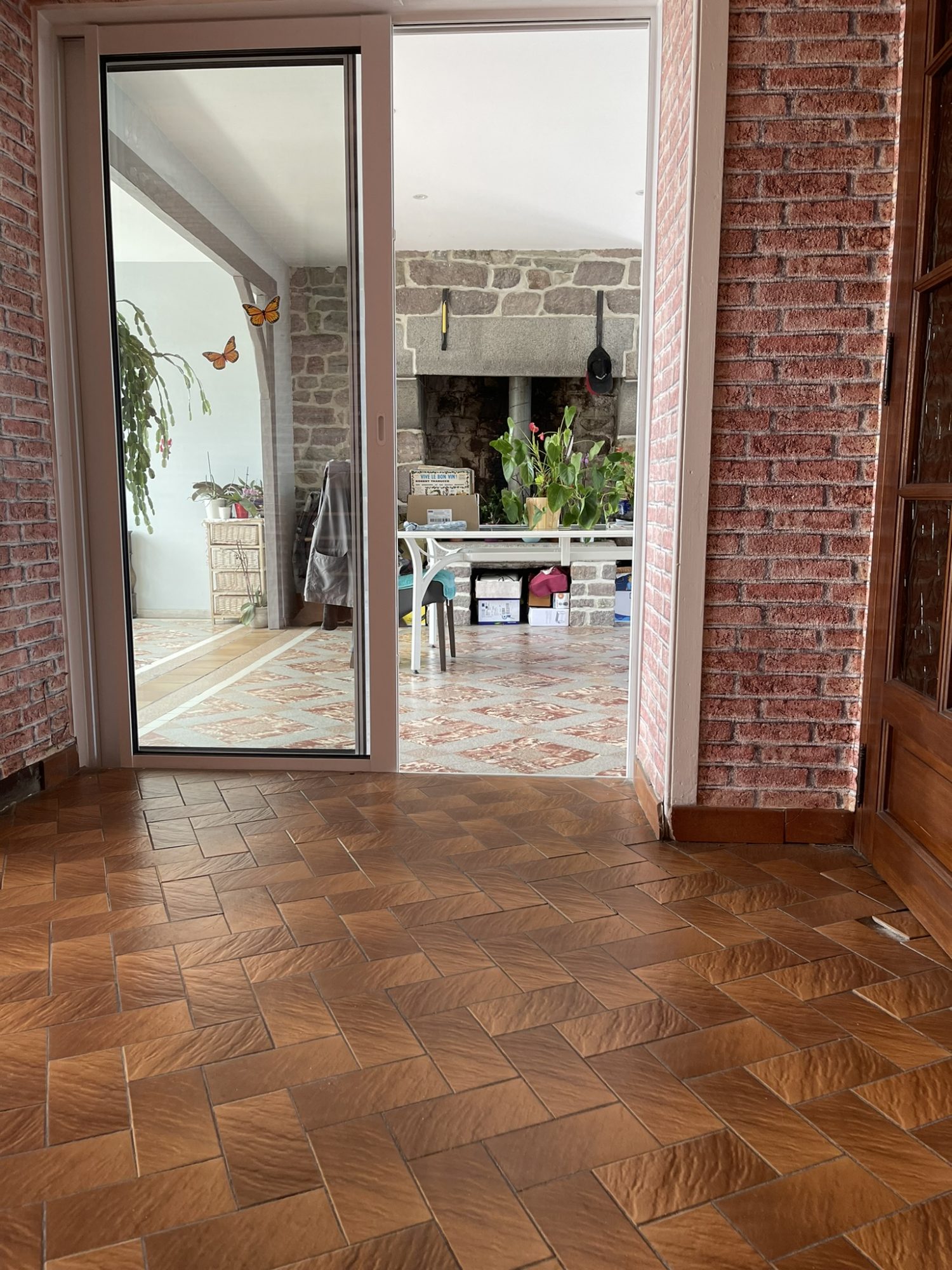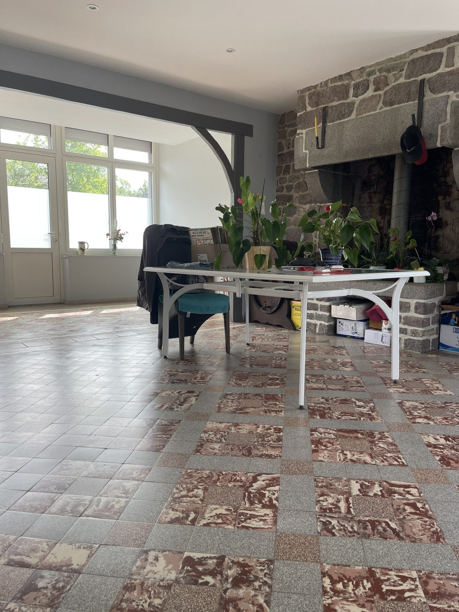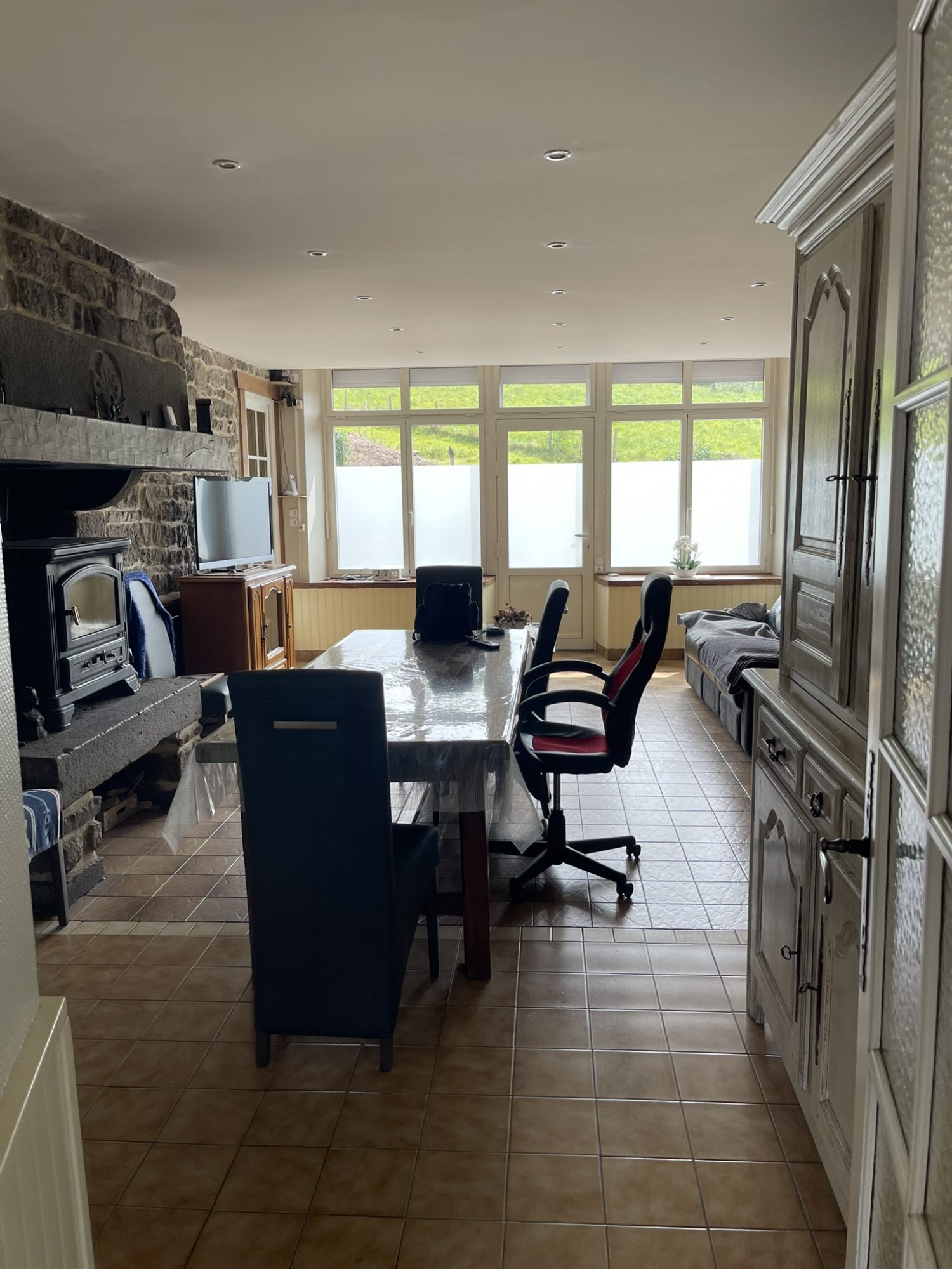 - Au-rez-de-chaussée : entrée, salon, salle à manger avec poêle à bois, autre salle avec cheminée ouverte, véranda avec terrasse, cuisine semi aménagée, bureau avec entrée privative, WC