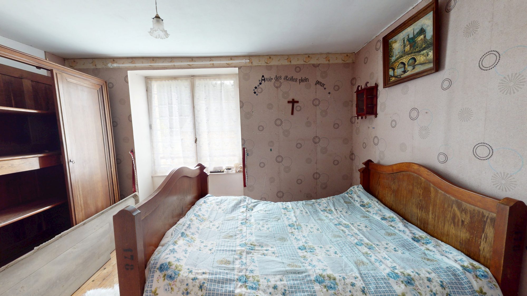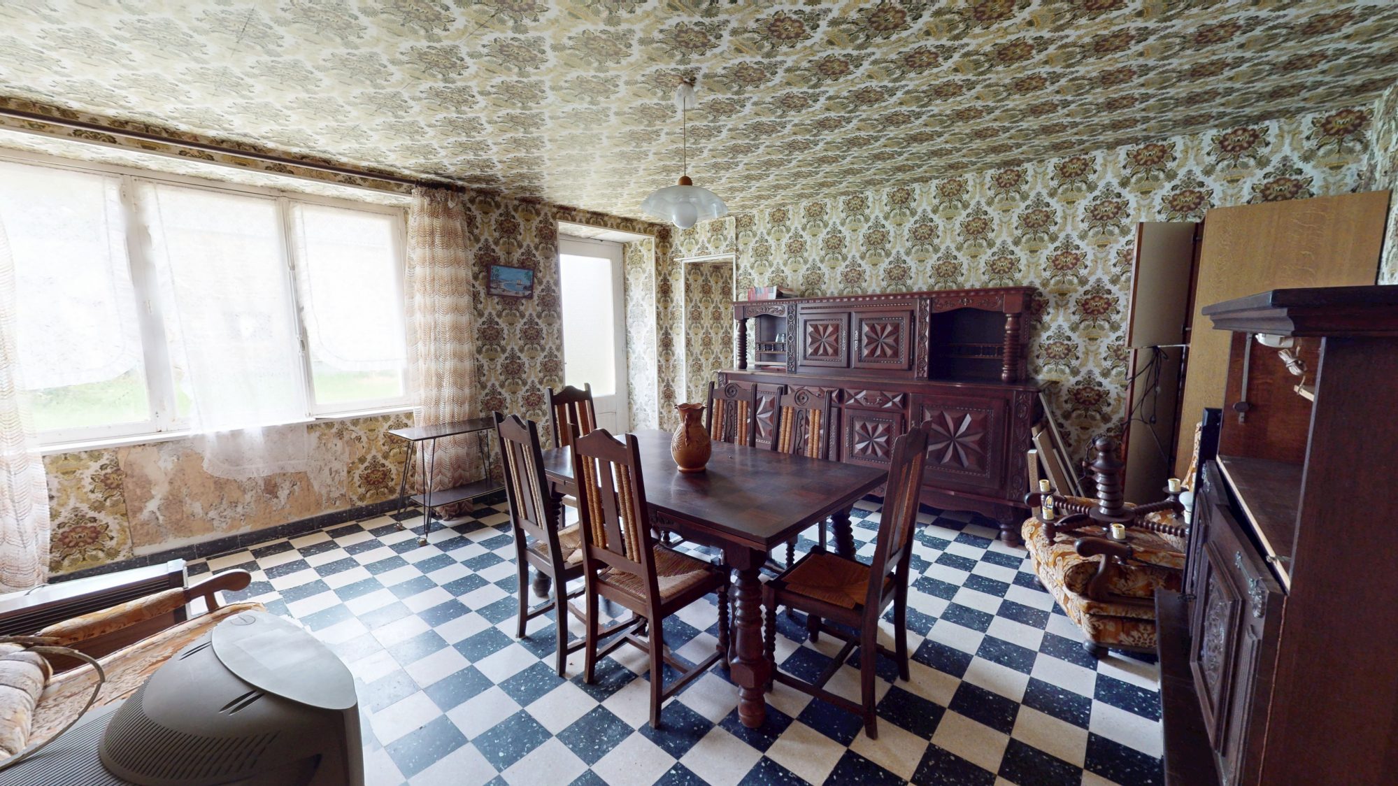 Huisseries bois simple vitrage. Pas de chauffage. Assainissement à mettre aux normes