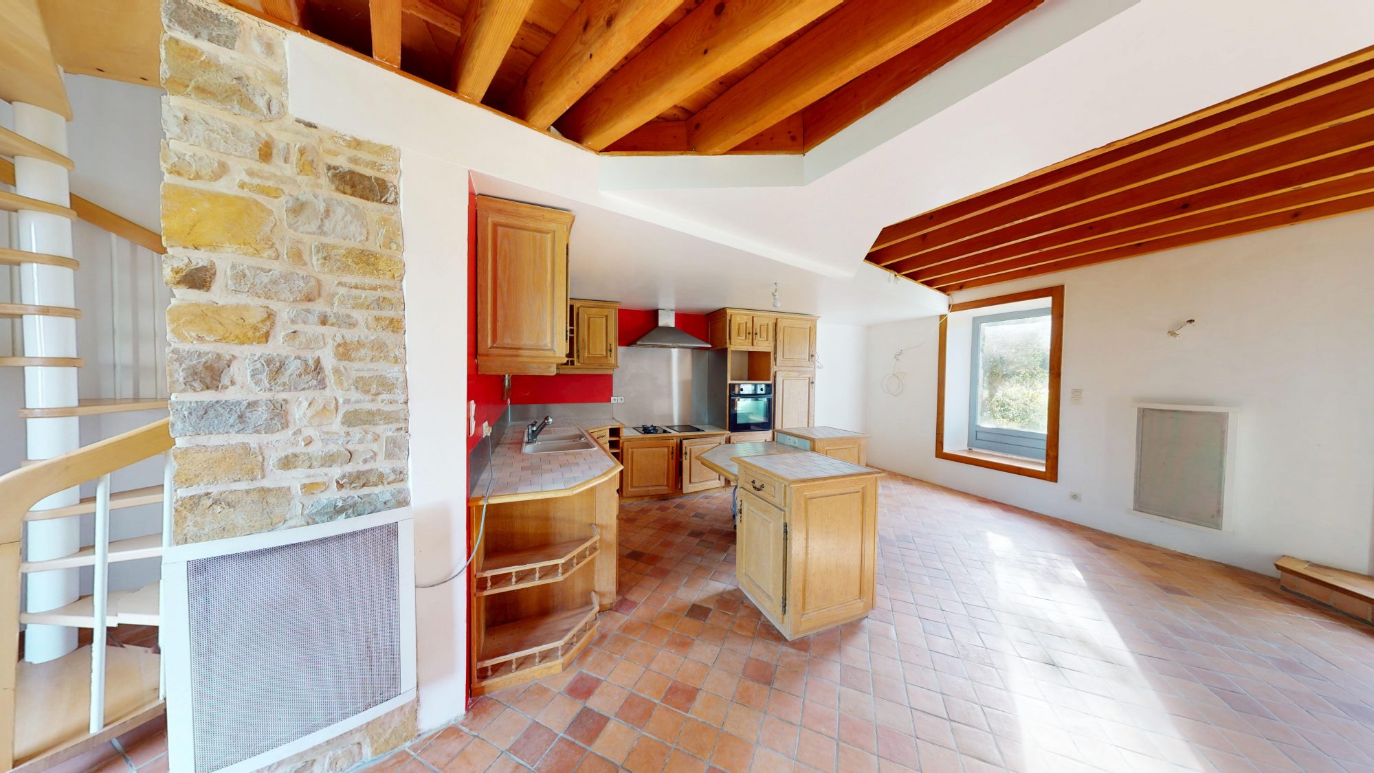 - au rez-de-chaussée : cuisine avec poêle à bois, buanderie, WC avec lavabo, deux chambres dont une avec cheminée insert, salle de bains ;