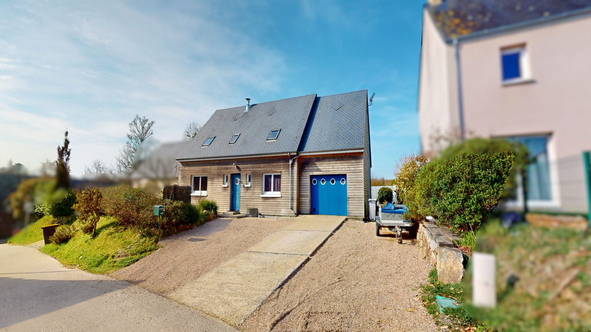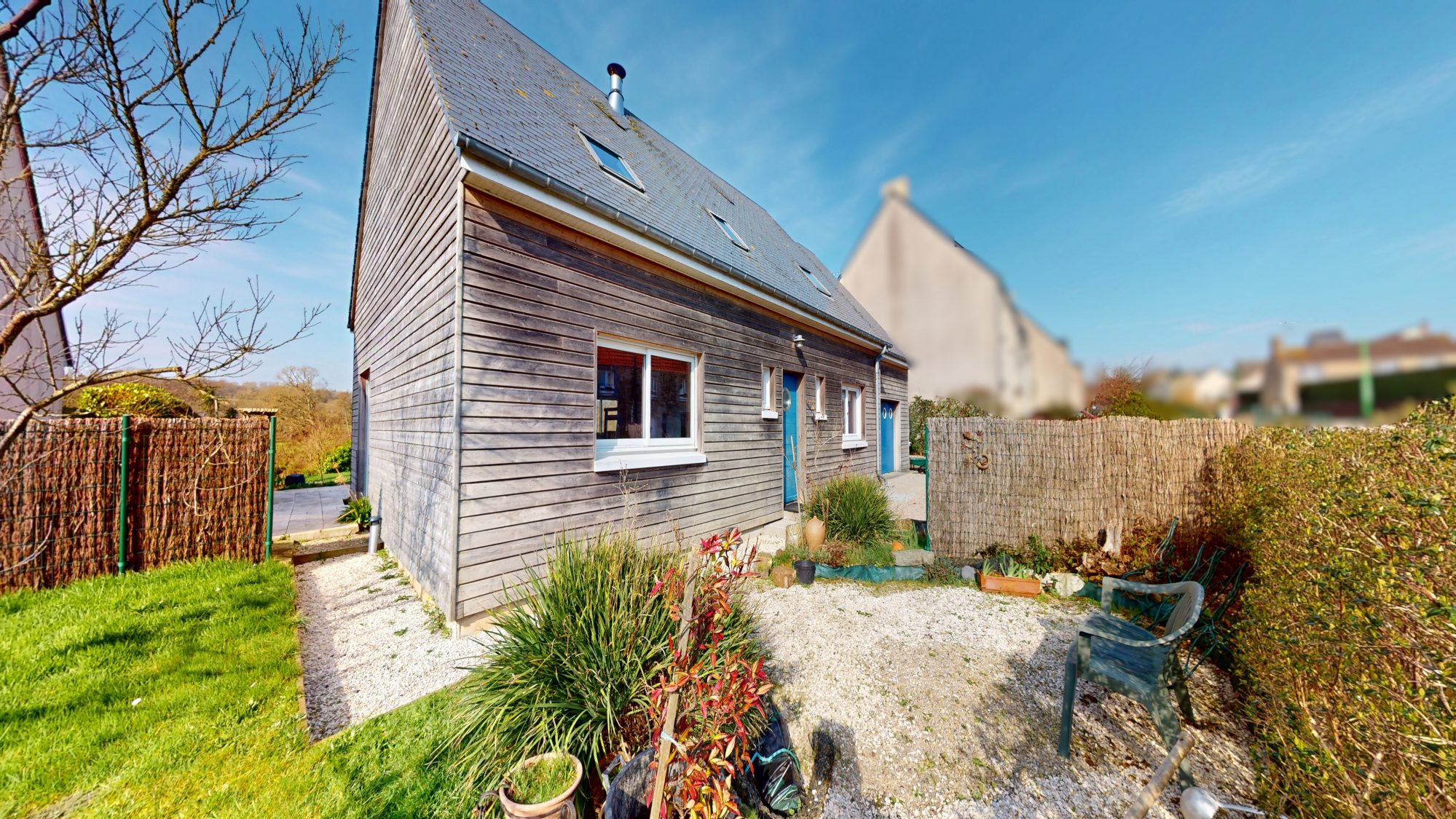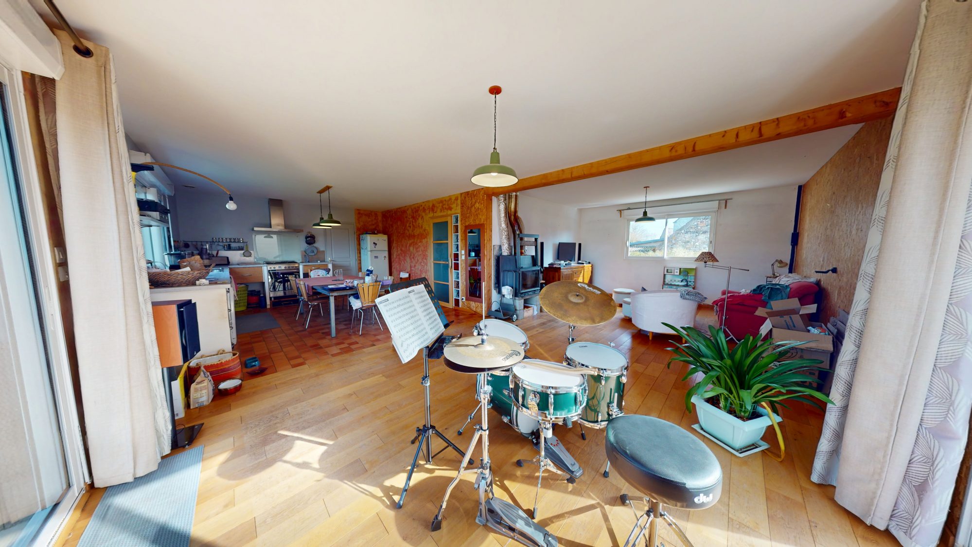 - au rez-de-chaussée : entrée, WC, bureau, séjour-cuisine ouverte avec poêle à bois, arrière-cuisine, garage avec grenier au-dessus ;