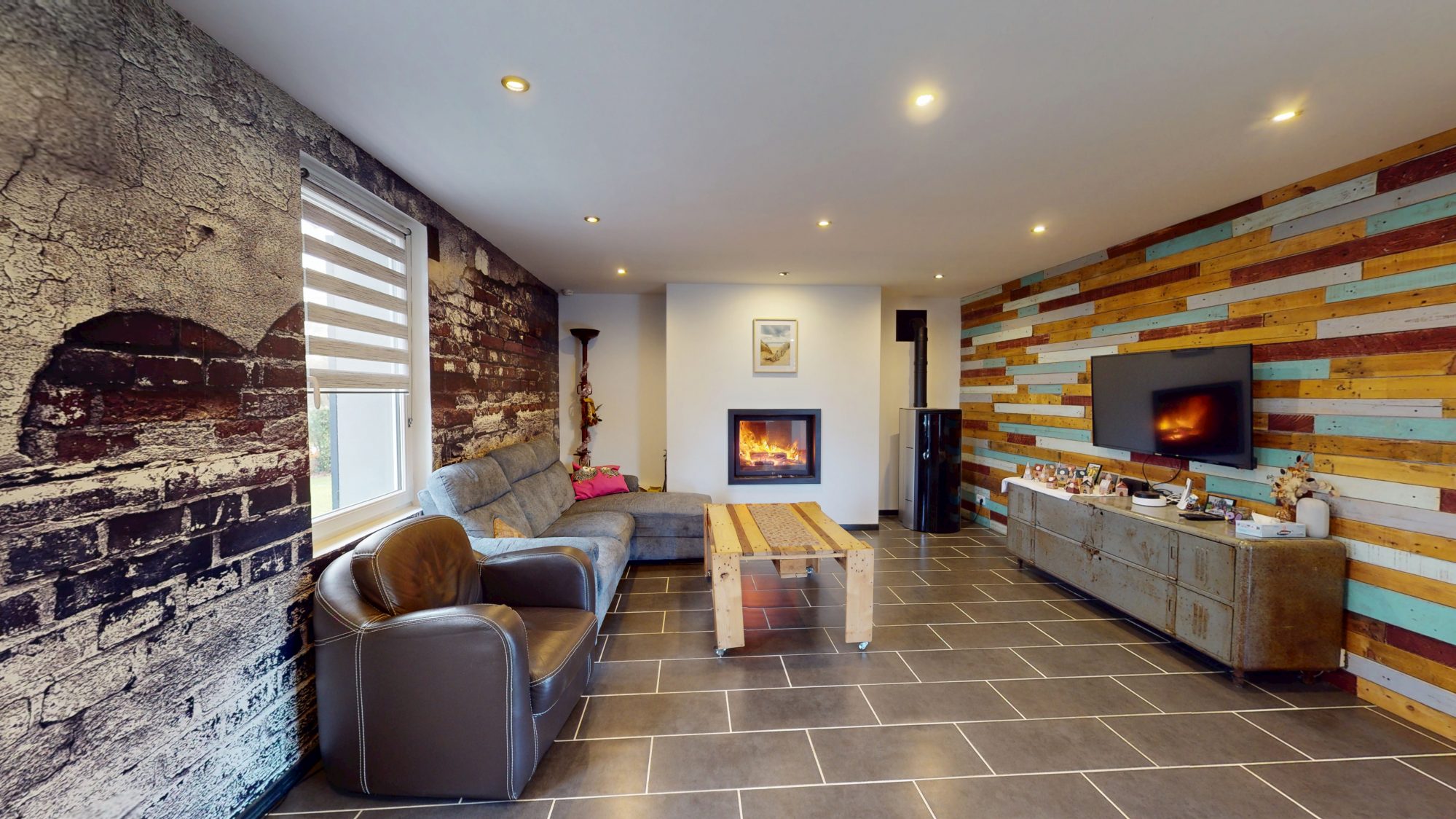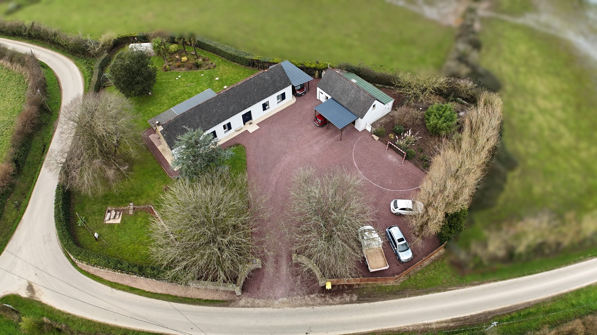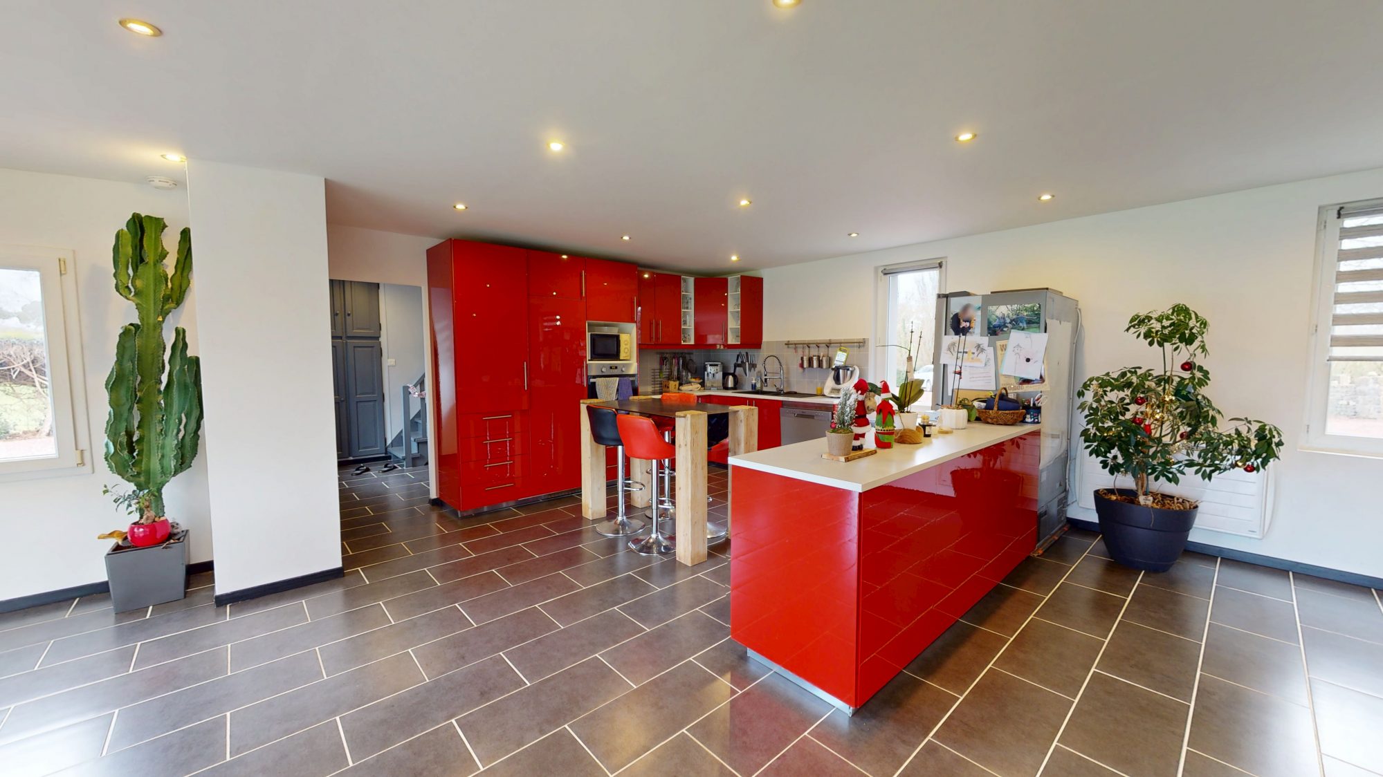 - au rez-de-chaussée : entrée, séjour avec poêle à bois et à granulés, cuisine ouverte, chambre avec salle de bains, dégagement et WC ;