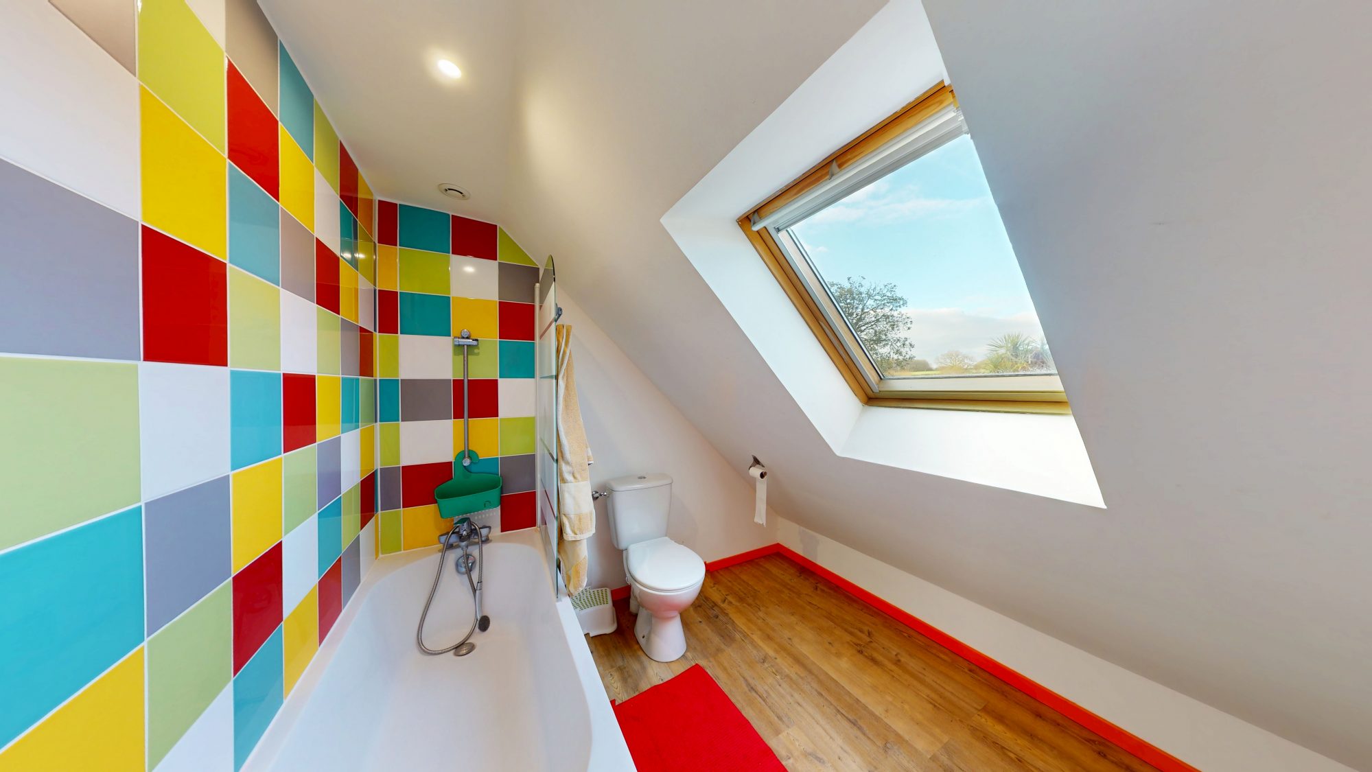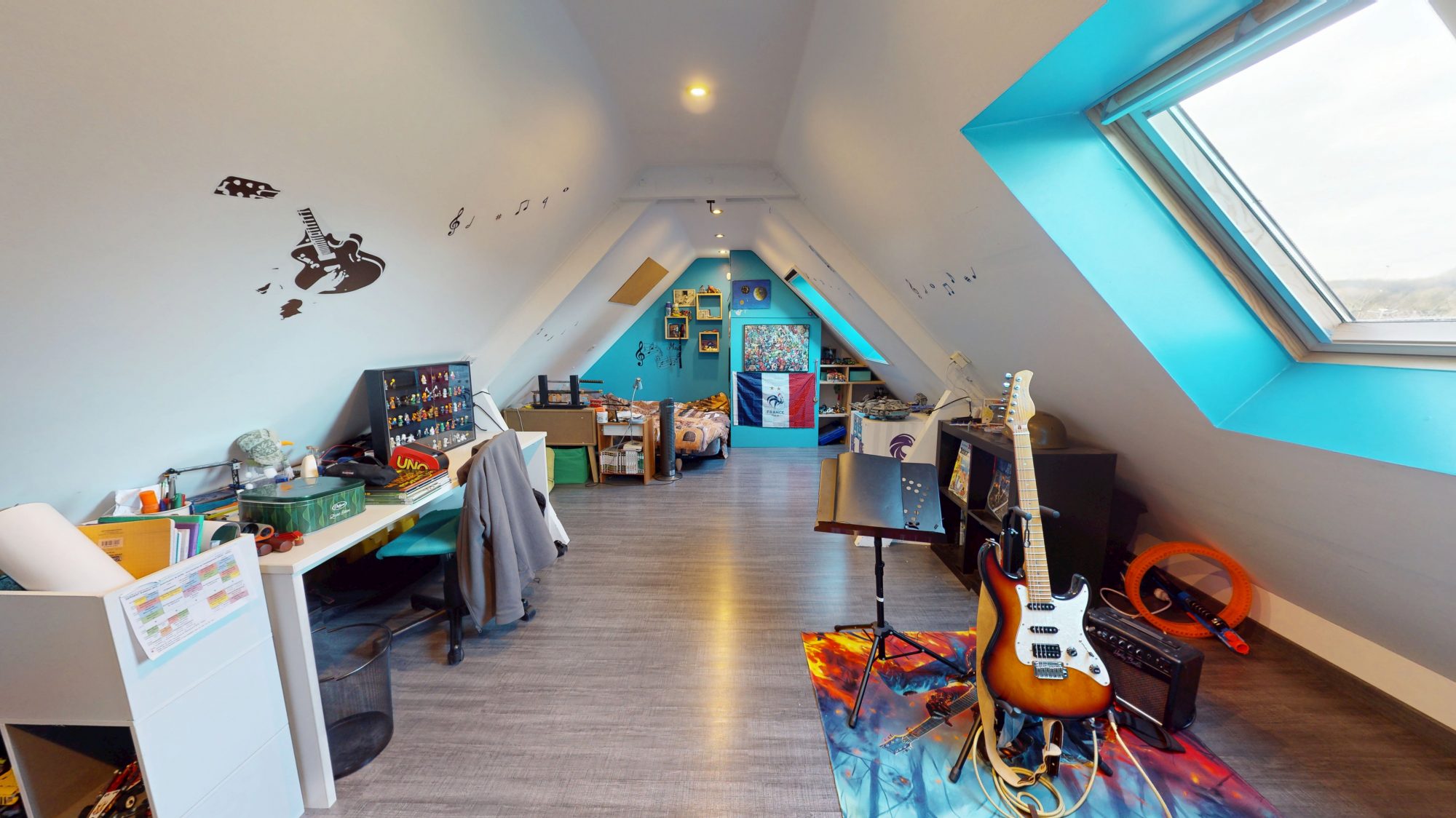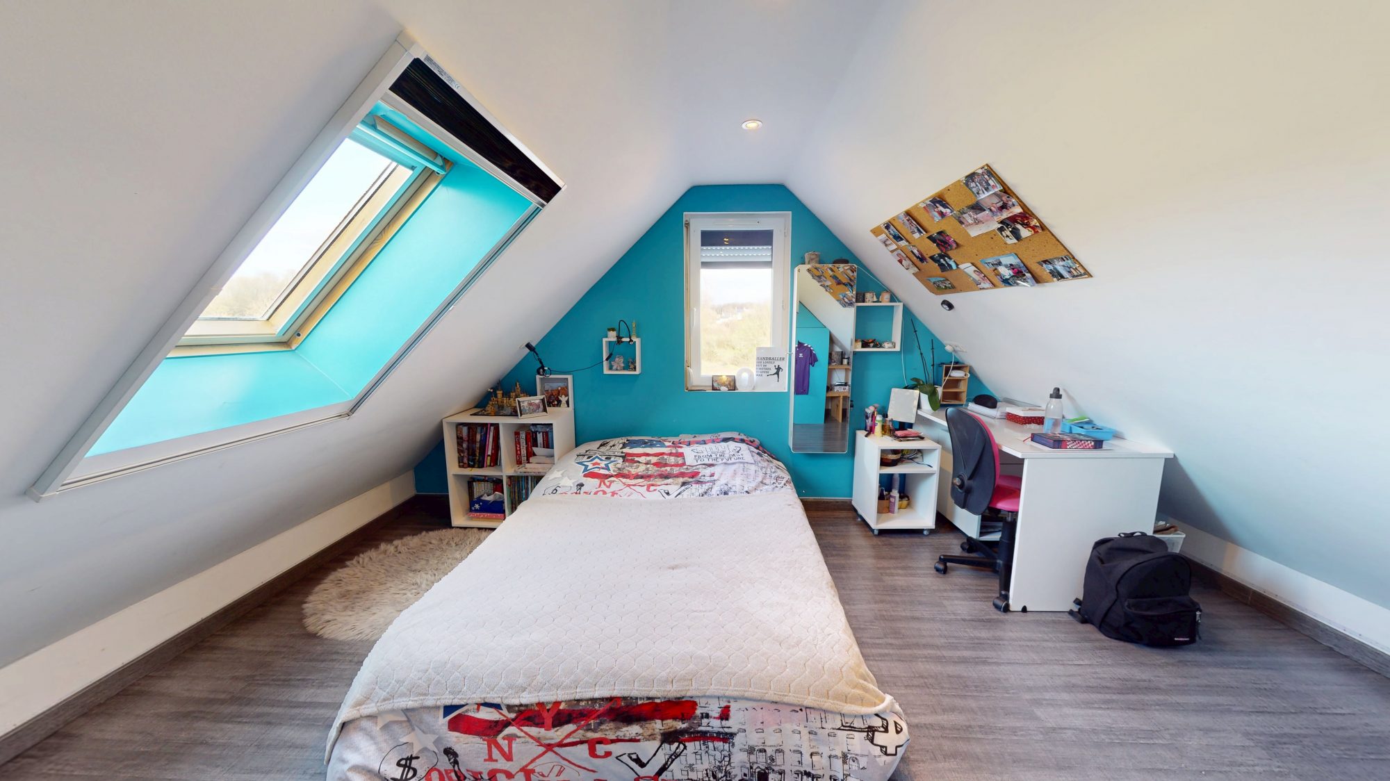 - à l'étage : palier, deux chambres mansardées, salle de bains et WC.