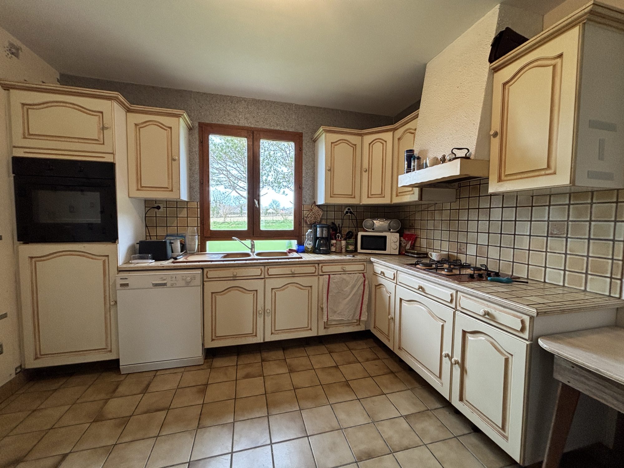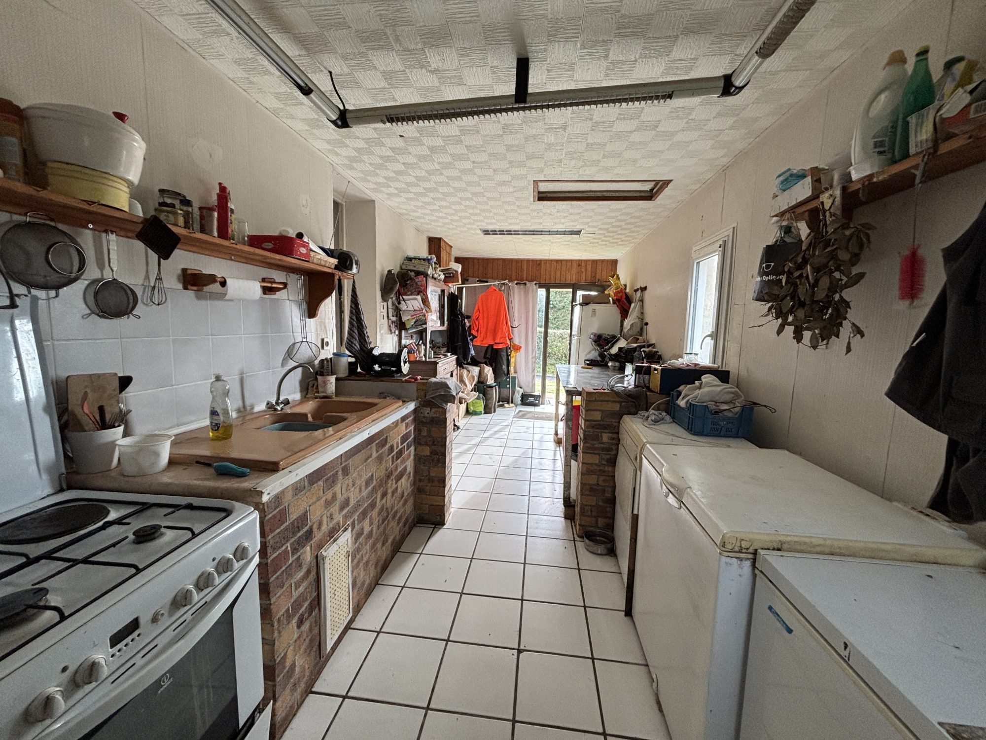 - Véranda, séjour/salon avec insert à bois, cuisine, couloir, salle de bains, wc et deux chambres.