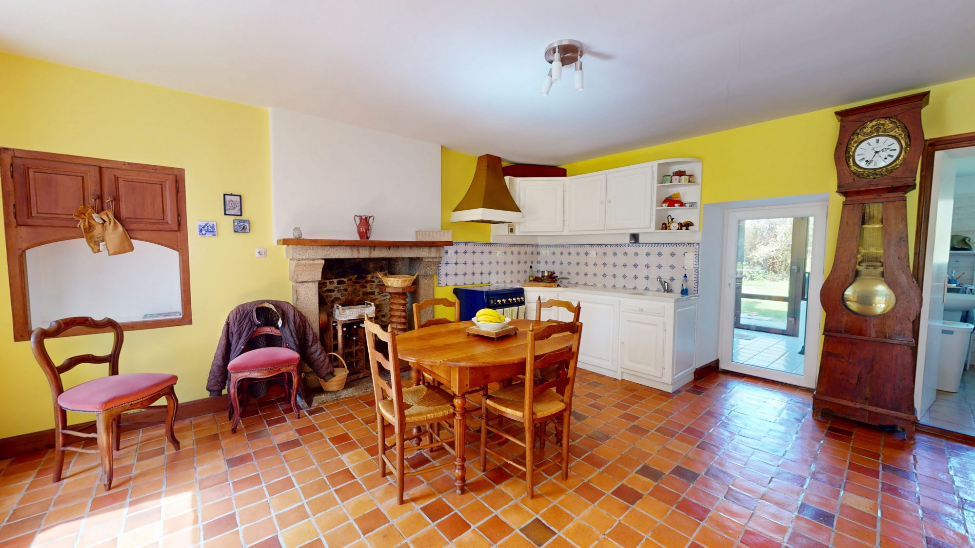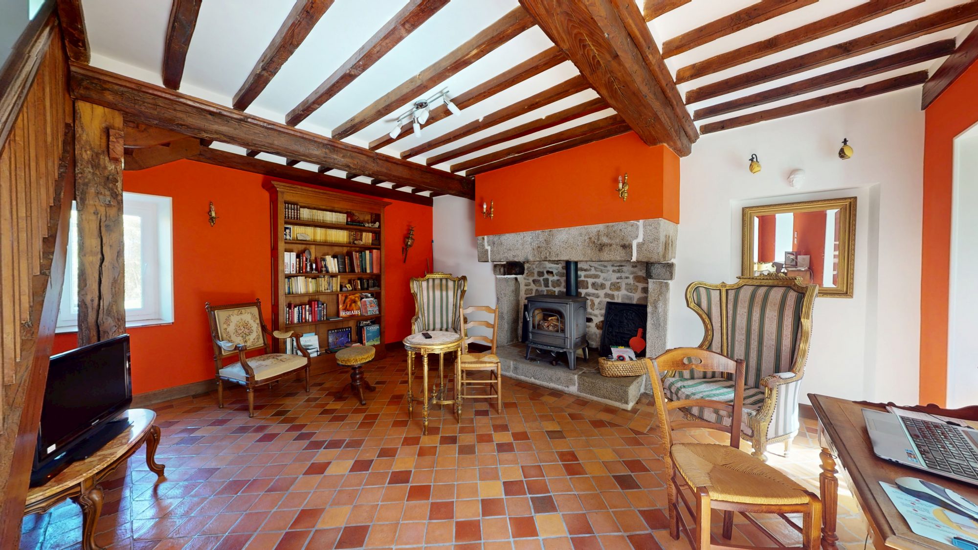 - au rez de chaussée : salon, cuisine, salle d'eau avec WC, véranda et séjour avec poêle à bois.