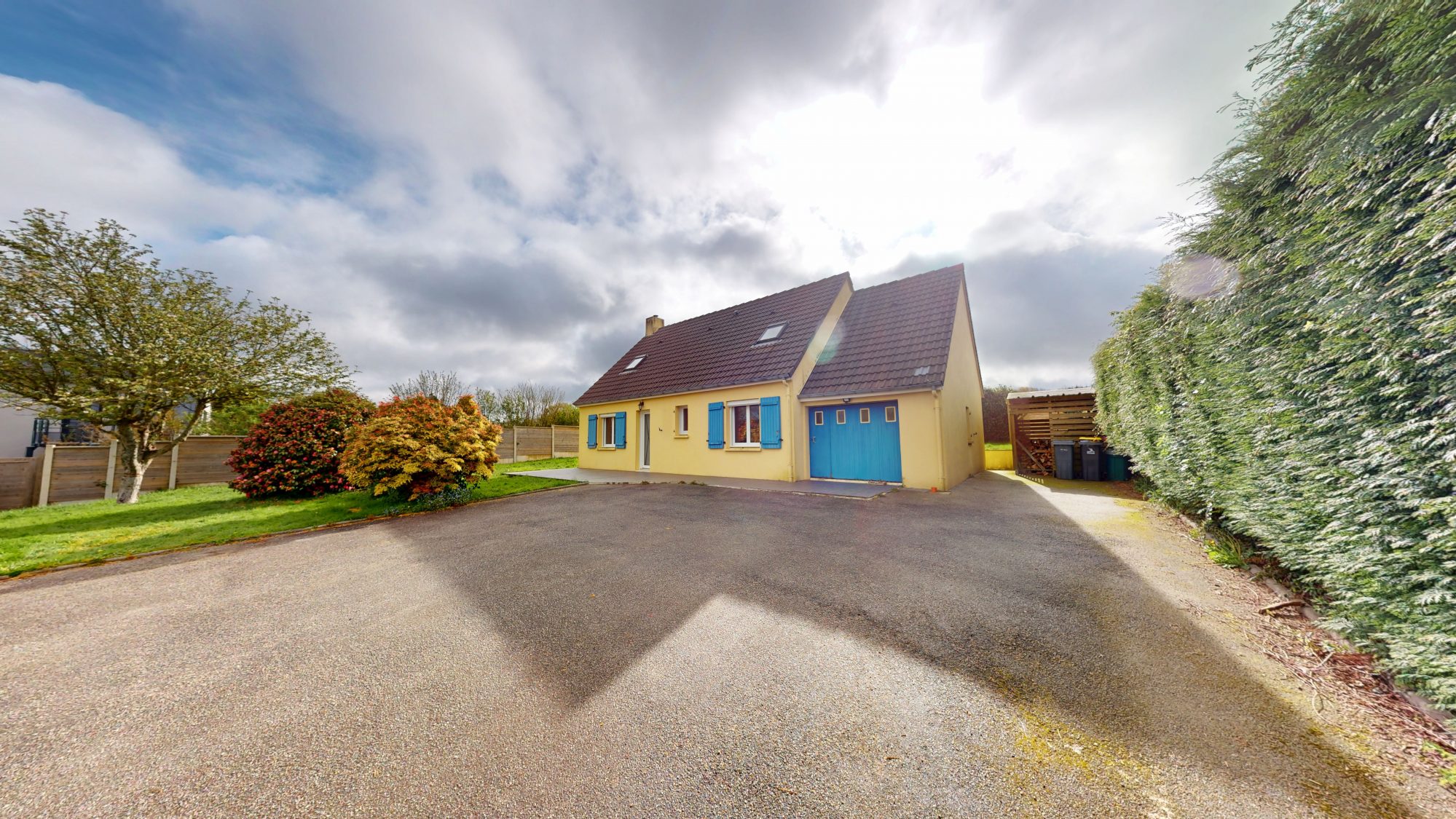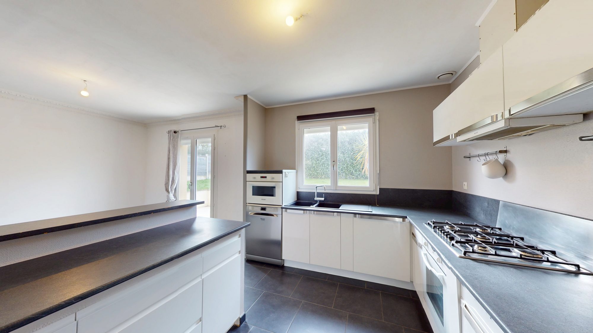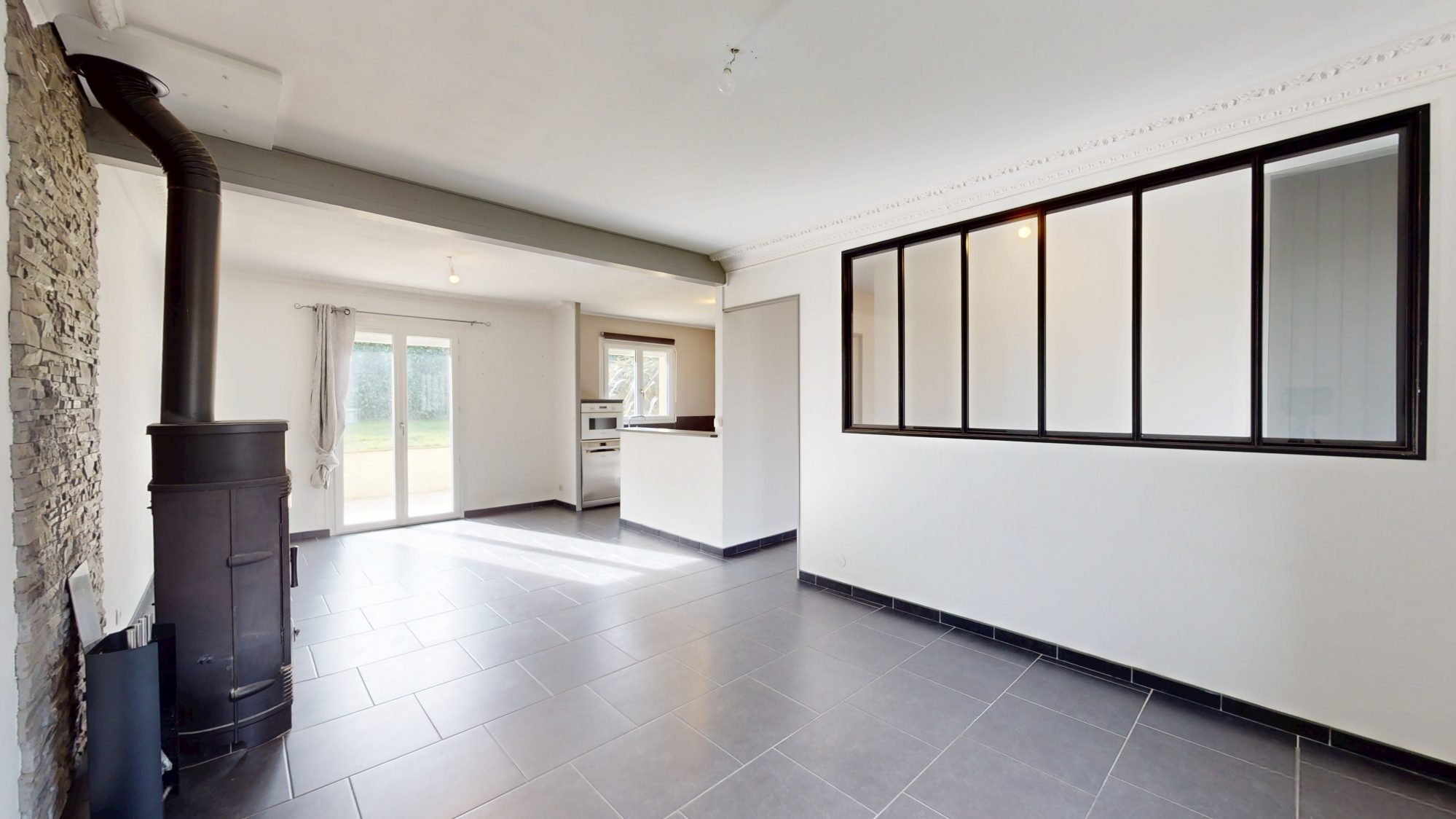 - au rez-de-chaussée : entrée, séjour avec poêle à bois, cuisine ouverte aménagée, couloir desservant WC, salle d'eau, deux chambres, garage avec grenier au-dessus ;
