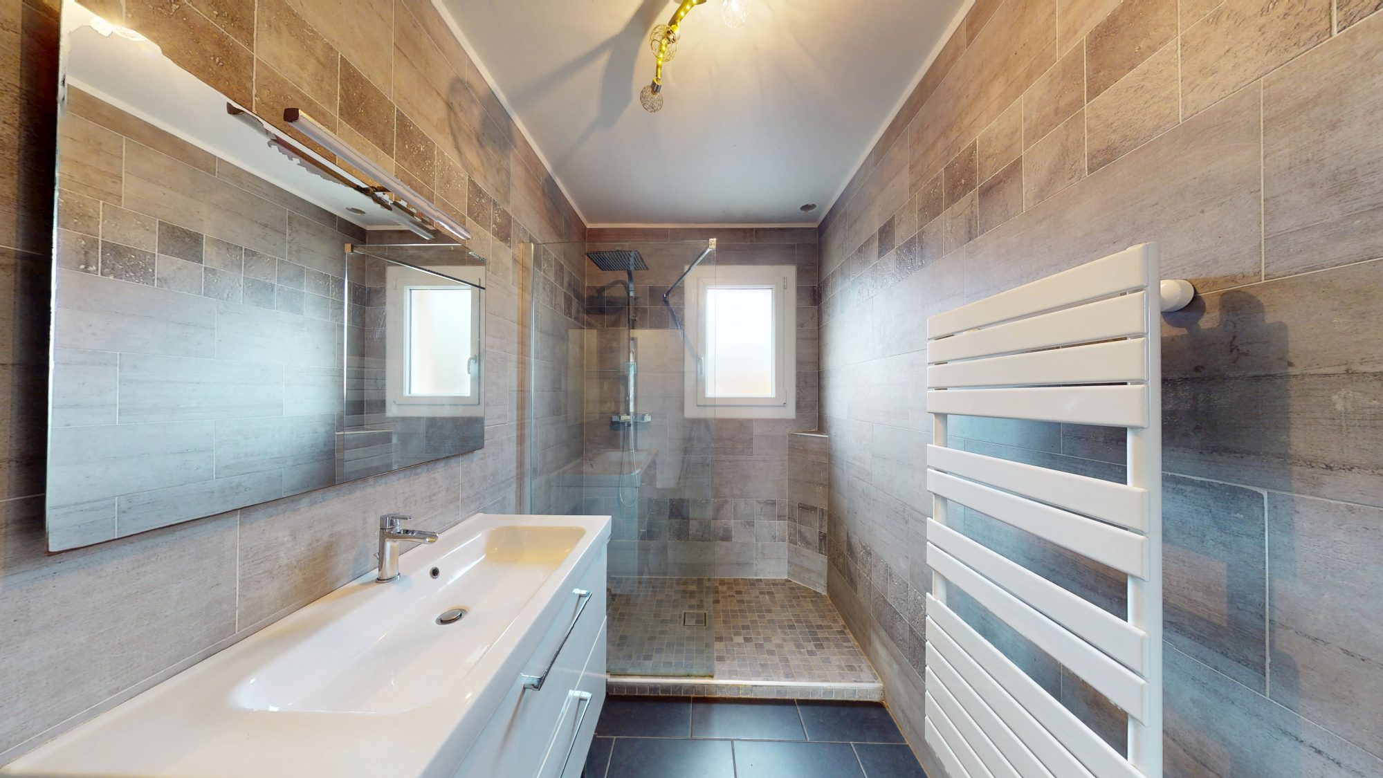 - à l'étage : trois chambres, débarras, WC, salle d'eau.