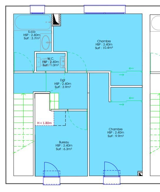 Au 1er étage : palier, chambre 1, chambre 2, bureau, salle d’eau, WC séparés.