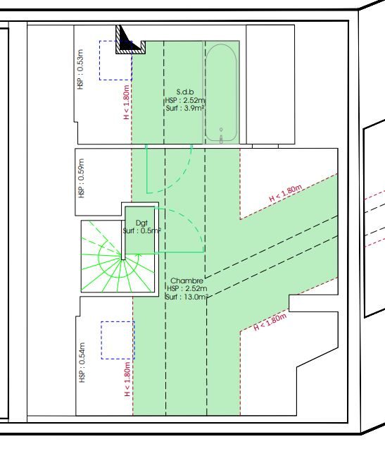 Combles : palier, chambre mansardée, salle de bains avec WC.