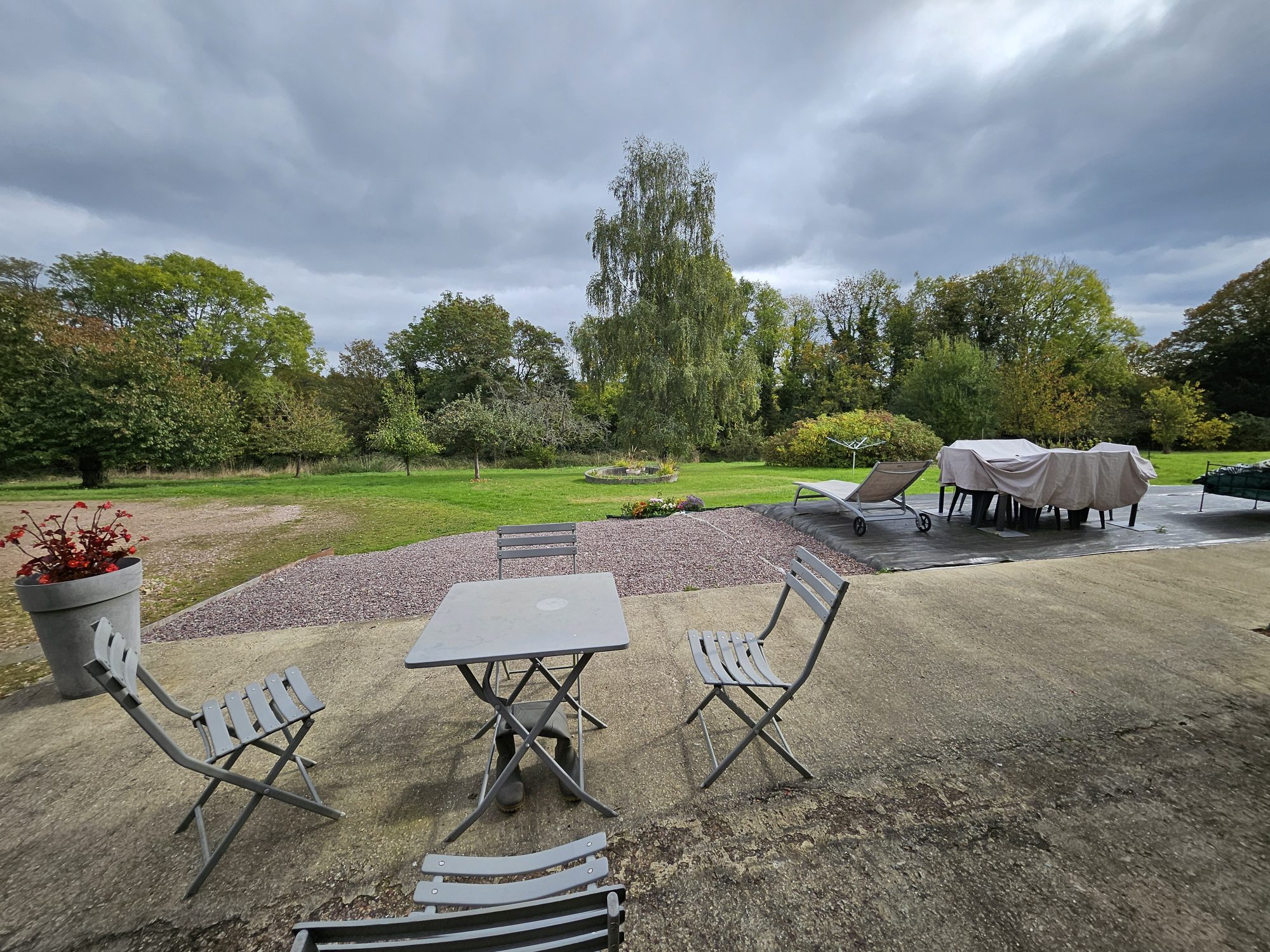 Cuisine aménagée-équipée, un salon ouvert sur séjour avec vue sur le jardin et terrasse, salle de douche, WC séparé, chambre.