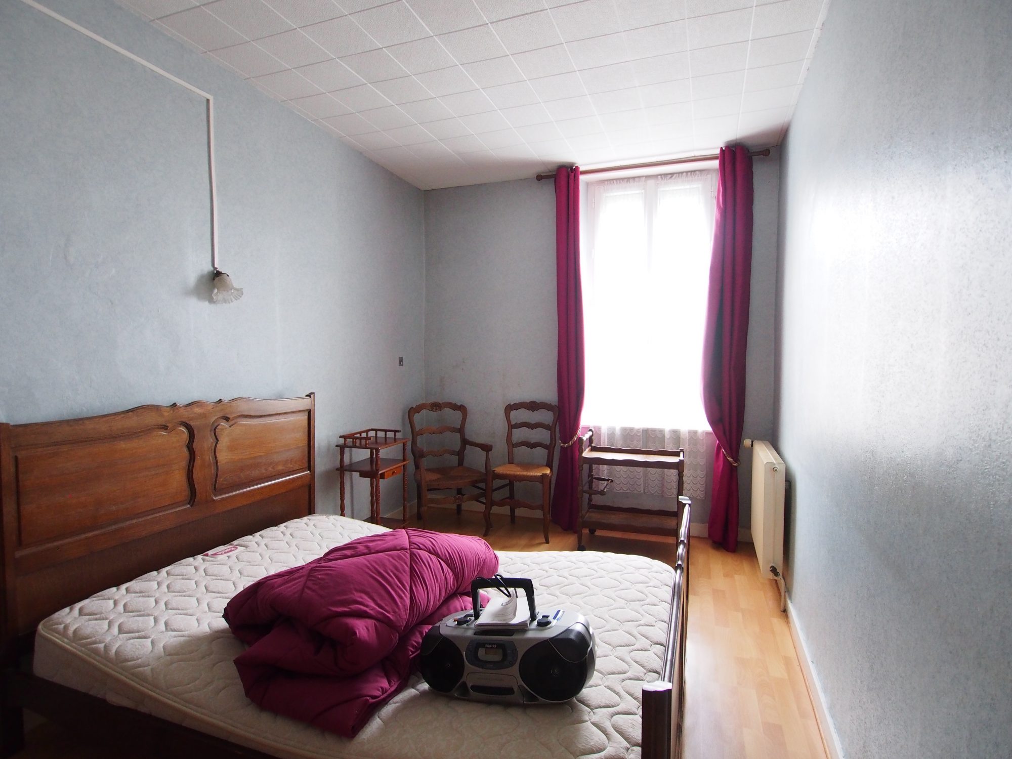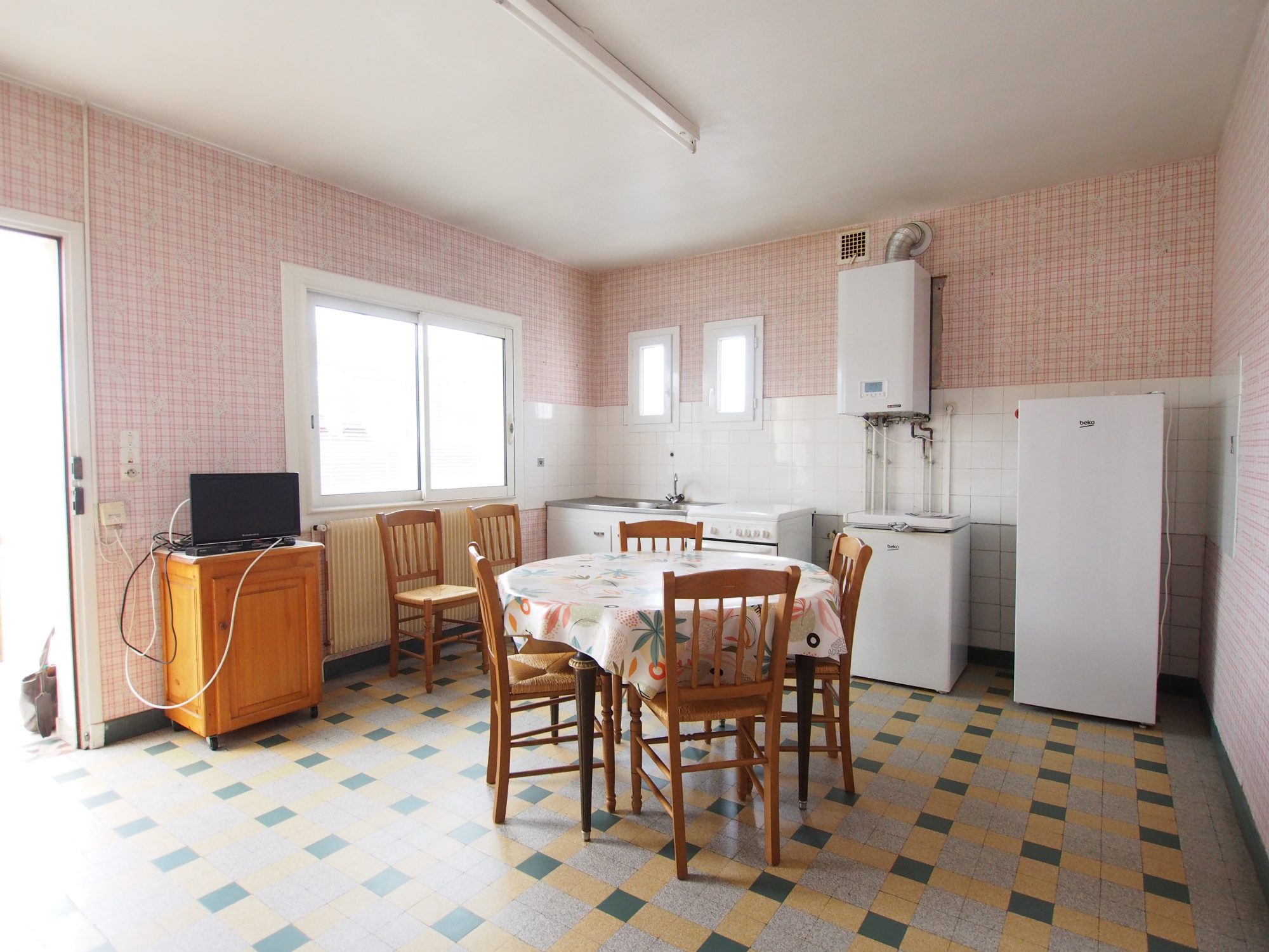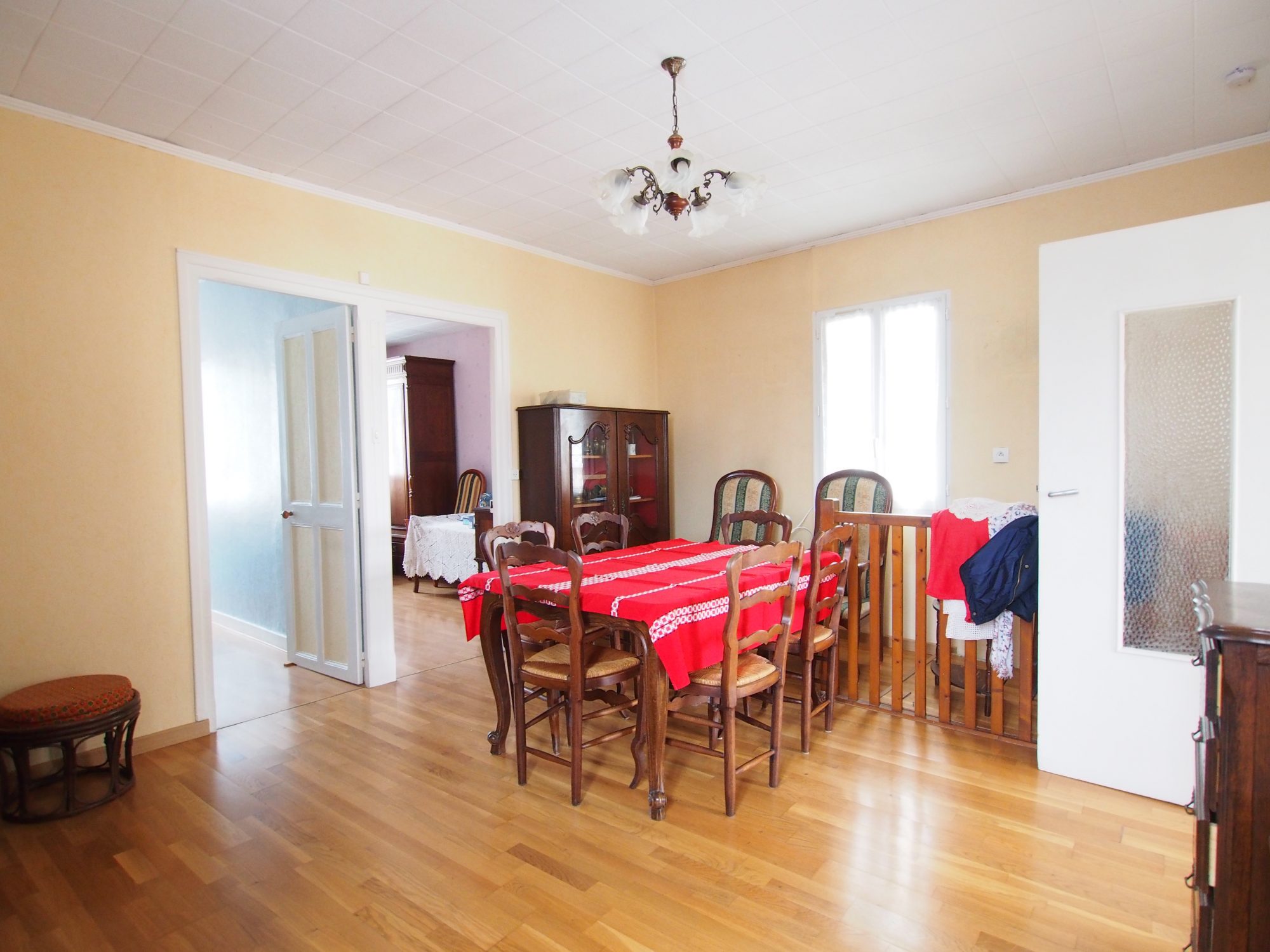 A l'étage, une véranda mène sur une cuisine avec arrière-cuisine, une pièce à vivre, deux chambres, ainsi qu'une salle d'eau avec WC.
