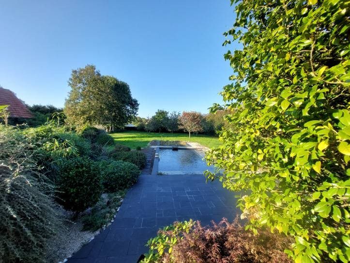 L'ensemble sur un terrain clos et arboré avec piscine naturelle, terrasse.