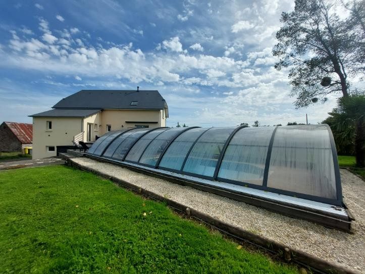 Piscine couverte et jacuzzi à l'extérieur avec terrasse et un terrain de pétanque.