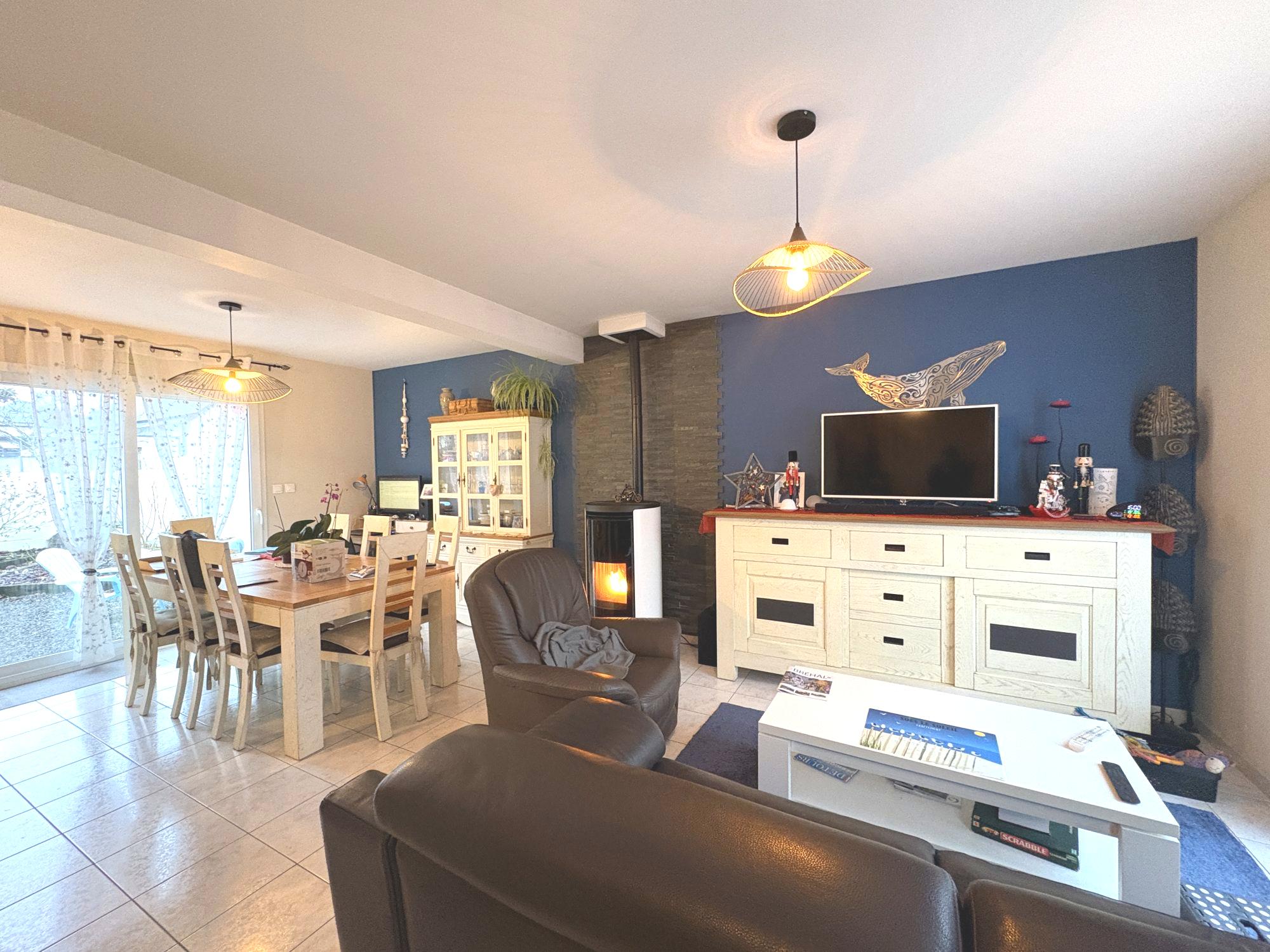Au rez-de-chaussée : une entrée desservant l'escalier de l'étage, WC, un salon-séjour avec poêle à granulés ouvert sur une cuisine aménagée et équipée.