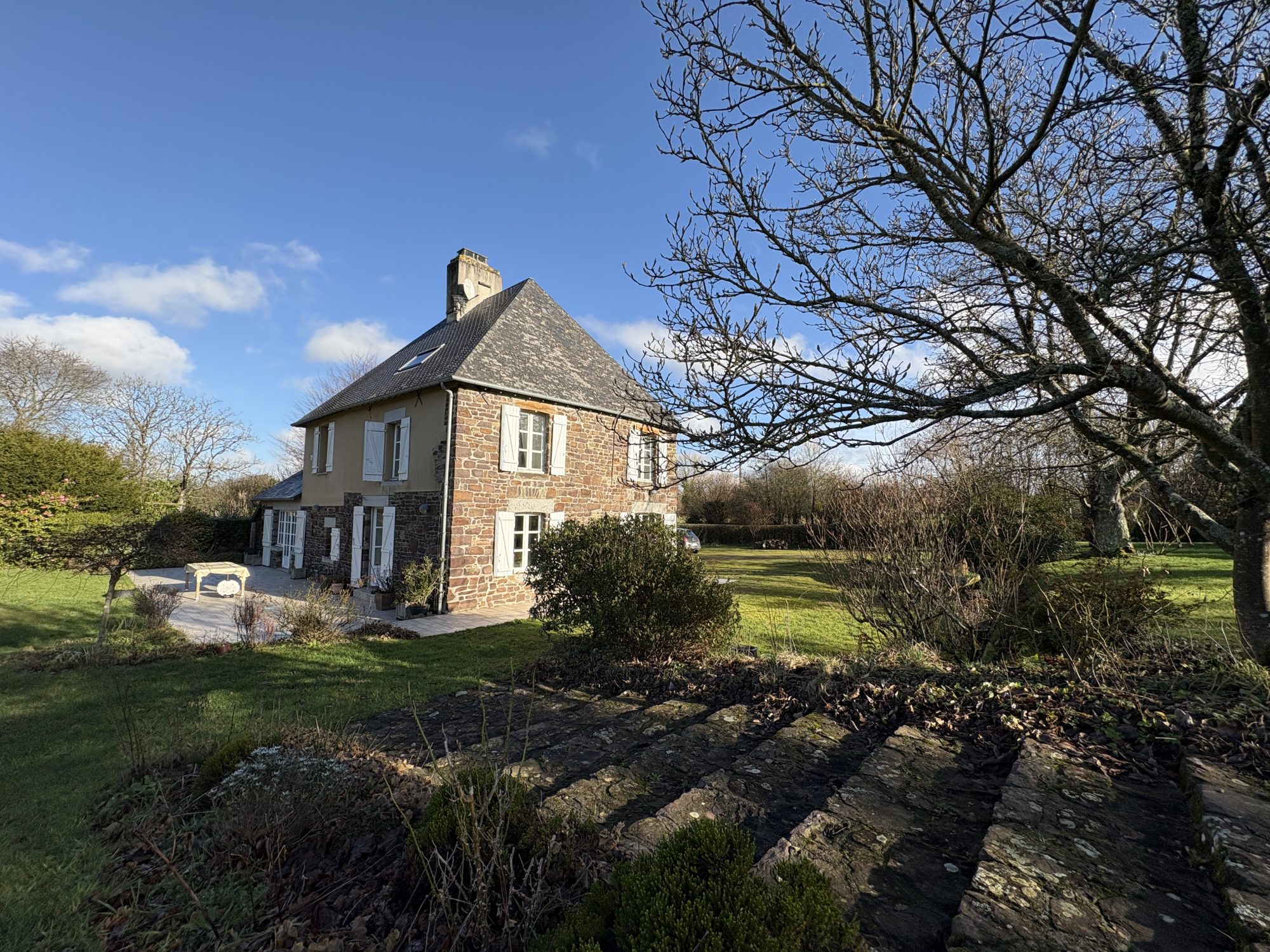 À 15 km de Granville et à 15 mins des plages de sable fin, sur la commune de FOLLIGNY, tous commerces à 4 km, dans un environnement calme et verdoyant, ancienne maison en pierre, entièrement rénovée par architecte en 2008, beaux volumes, grande luminosité, grande cour et jardin paysager, d’une superficie de 3 930 m².